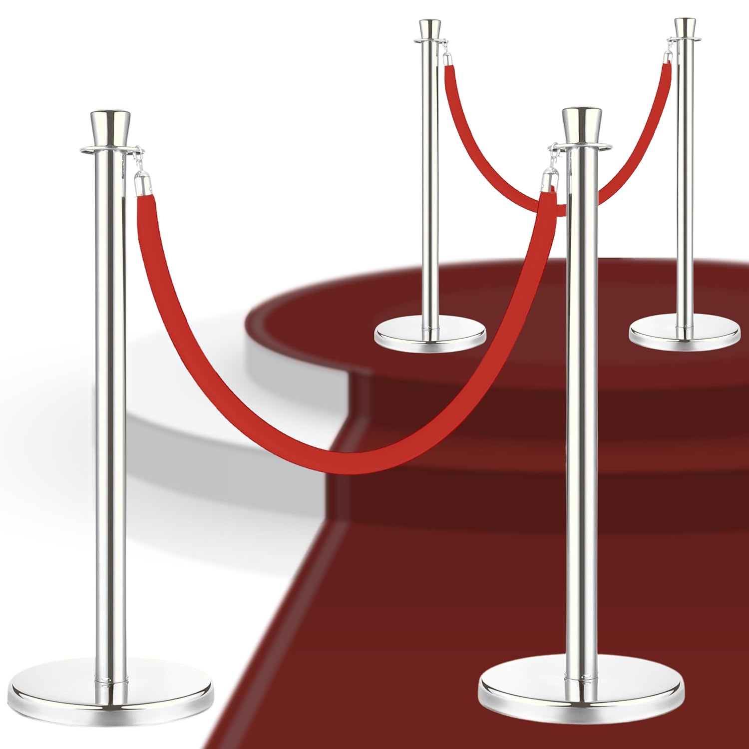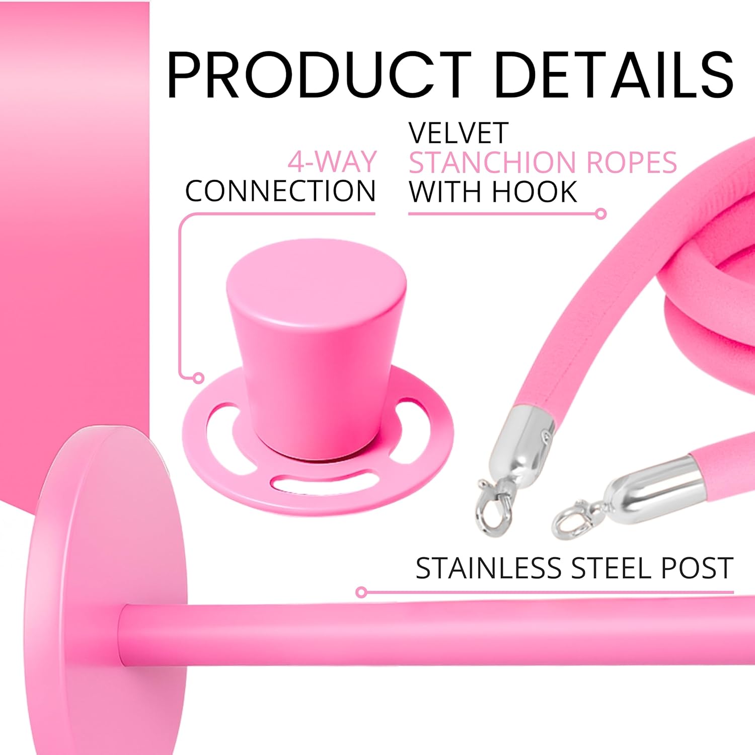 This pink stanchion kit offers 4 stainless-steel posts and 2 velvet ropes, each 5 ft long and 1.25" thick, creating a stylish barrier for parties, venues, and décor zones. The vibrant finish gives the space a polished, playful feel. Designed for smooth crowd flow, the set works beautifully for boutiques, weddings, birthdays, and themed photo areas. The system connects quickly, functioning as a dependable stanchion and rope layout while providing the standout look of pink velvet ropes and posts. With durable construction and bright color appeal, it also serves as a practical pink stanchion ropes and poles configuration for event entrances and a fun alternative to traditional pink sanctions poles set.