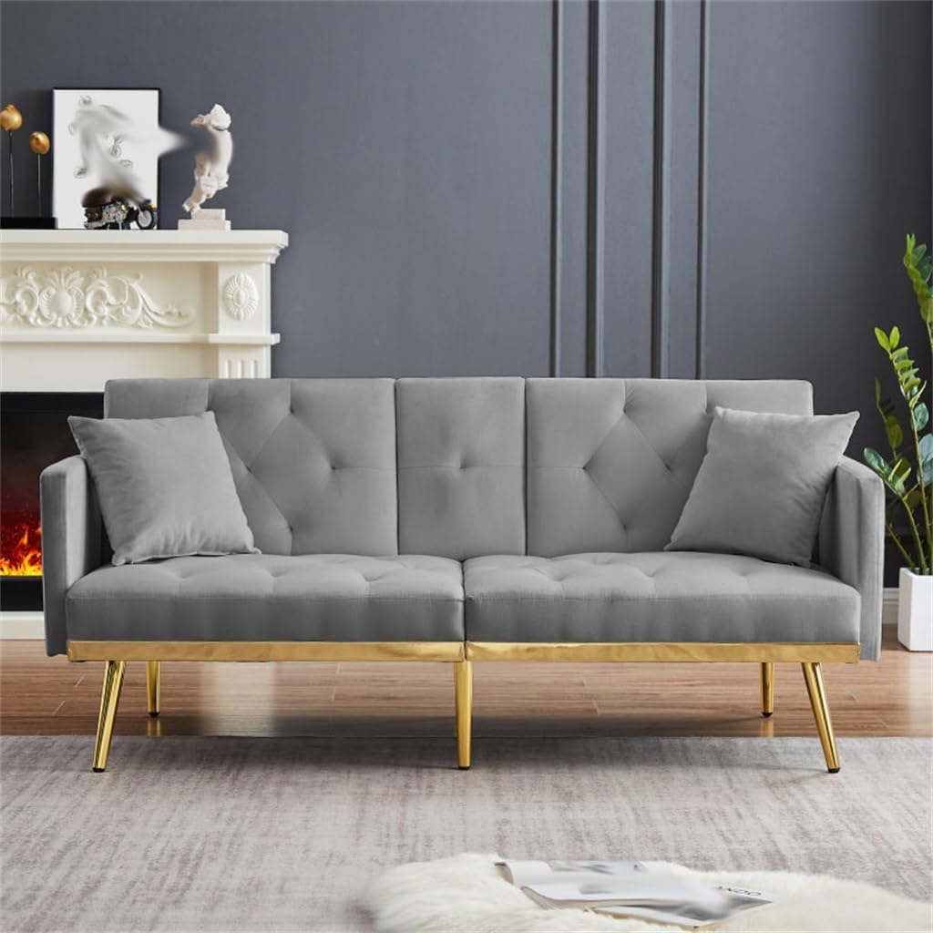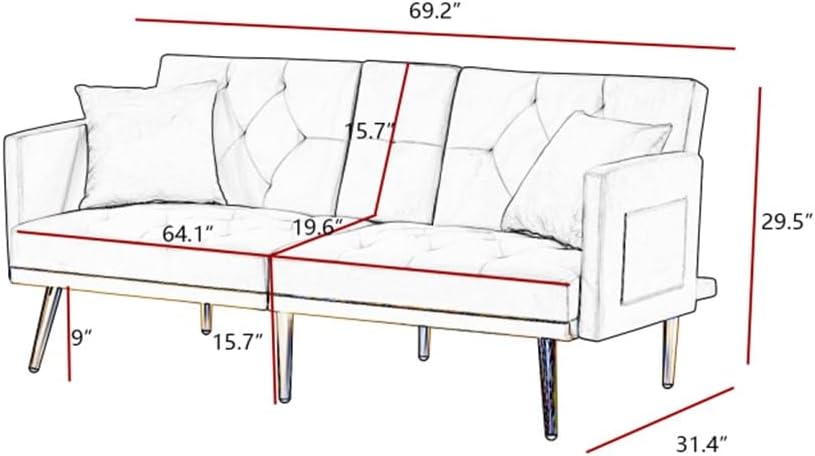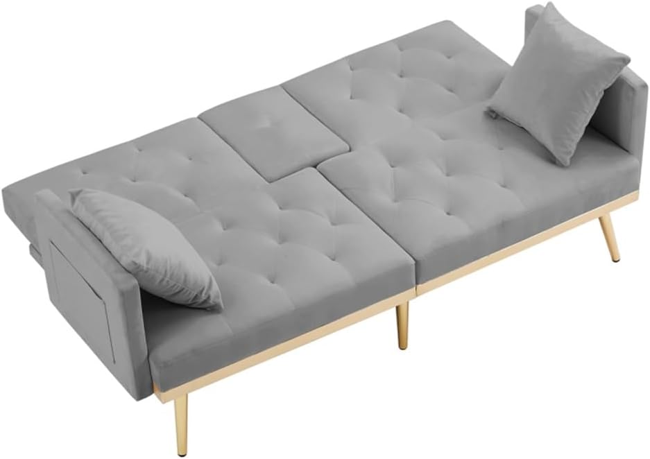 Loveseart Sofa Bed : This muti-functional sofa bed makes the household environment of small space living more optional. Suitable for any apartment or studio to improve the comfort of life and work.Converts into a Bed : Stay prepared for overnight guests by taking advantage of the adjustable back to switch from sofa to a comfy bed in just seconds.Multiple Adjustable Positions : 3 adjustable positions can offer different comfort to you.if you want to watch TV in your living room you can adjust the back rest , if you want to take a nap you can adjust the angle to 180 °as a bed. All in all, the adjustable back rest can meet your different needs in your life.Durably crafted with velvet fabric and gold metal legs, this convertible futon sofa fuses comfort and that will last in your living space for years to come .Assemble Easily: With the help of detailed instructions , you can assemble it easily .Notes : Please read this note before you assemble the sofa . Those legs & hardware & Sofa parts all put inside the sofa bottom , please unzip the zipper on the sofa bottom and take out all the parts .Upholstery Material : FabricLeg Material / Color: Metal /goldSeat & Back Fill Material : FoamFrame Material:Solid + Manufactured WoodSeat Construction:Sinuous SpringProducts1*Loveseat sofabed(no other presentation items included).Notice:1. Due to manual measurement, please allow 2-3% error, before you bid, please make sure you don't mind.2. The color may vary due to different displays, please refer to the actual product.