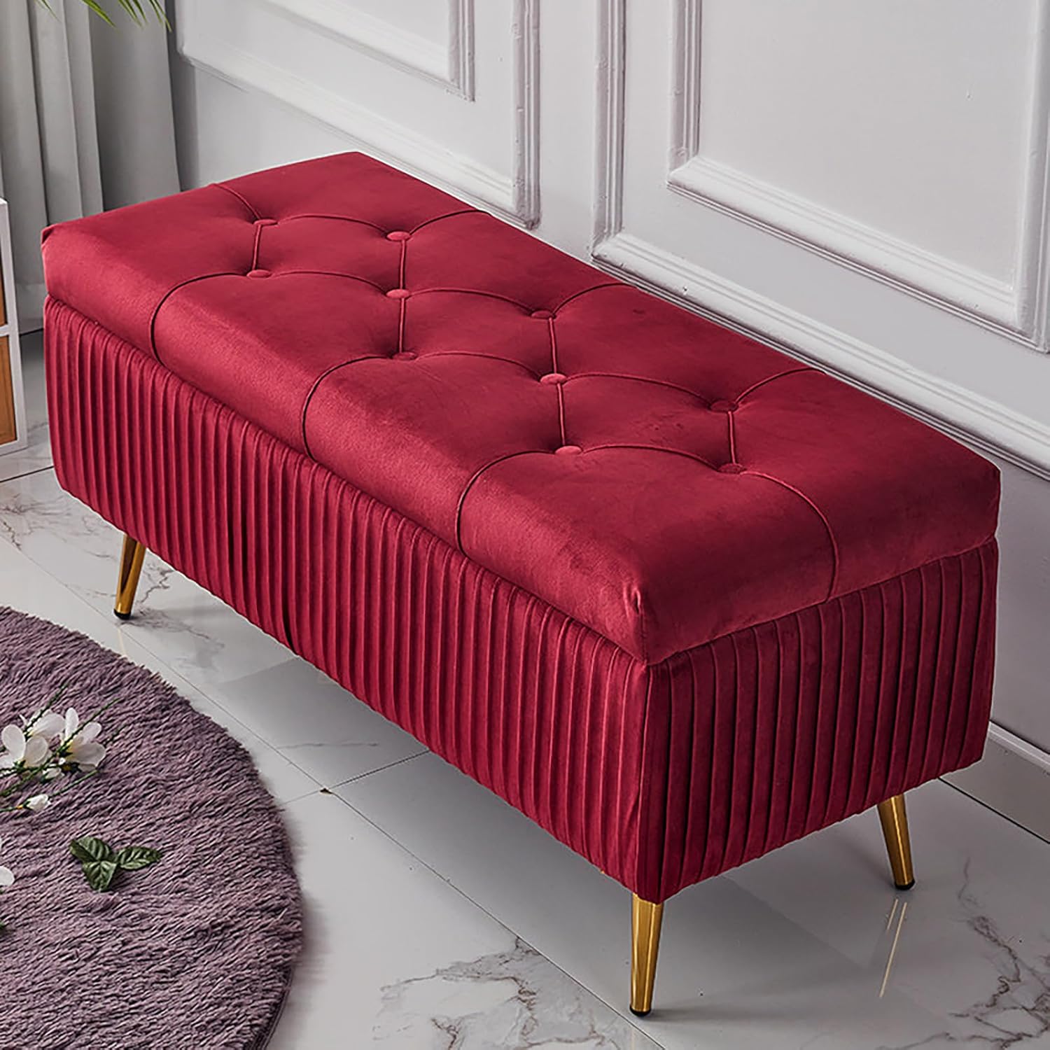 Velvet Storage Ottoman BenchThis versatile velvet bench combines elegance with hidden storage. Featuring soft velvet upholstery, a sturdy metal frame, and a spacious under-seat compartment, it provides a stylish and practical solution for extra seating, shoe storage, or bedroom organization, supporting up to 330 lbs.Specifications: Product Name: Storage Ottoman Bench Materials: Velvet, Foam, Solid Wood, Metal Features: Upholstered, Hidden Storage Load Capacity: 330 lbs Suitable For: Living Room, Bedroom, Entryway Size Options: Multiple sizes available (check size chart)Package Includes:1 x Velvet Storage Ottoman BenchNote:Please check the product dimensions carefully before purchasing. Refer to the size chart to select the best fit for your space.