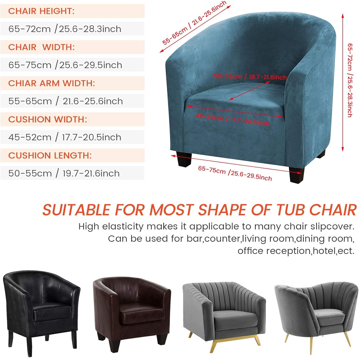 Why do you choose our Club Chair Slipcover? Have you been looking for a way to keep your chairs protected from damage? Would you like to hide the edges of wear, spils, stains and worn, as well as shabby?Are you upset about the corners of your chair being damaged again? Are you struggling to find a club chair slipcover that can be used for all occasions? Our velvet armchair covers is a appropriate good enough choice.That is undoubtful a good choice for you. This velvet armchair slipcover can not only give people elegant and stylish feel, but also prevent damage and make your old chairs or ugly chair look elegant, luxurious and new instantly!When you touch it, the soft feeling can bring you an amazing experience.It is a convenient way to promote happiness without a big expense. Specifications: Material:High advanced soft,non-slip and comfortable velve+High elastic Polyester fabric. Size: (approx.). Chair height:70-90cm /27.6"-35.4". Cushion width:40-50cm / 15.7"-19.7". Chair Width:55-75cm /21.6"-29.5". Package Content:2 x Velvet Tub Chairs Cover. Easy Care: Machine washable in cold water. Wash separately at gentle cycle. Using mild laundry detergent. Do not bleach and iron. Pls Notes: ✔Please check the product size and style before purchasing. ✔We recommend that you buy a chair cover that is slightly larger than your chair.because we are making our products by hand, there may be a deviation of about 2-3 cm.. ✔Because slipcover is elastic, do not iron. If ironed, will lose some elsticity.