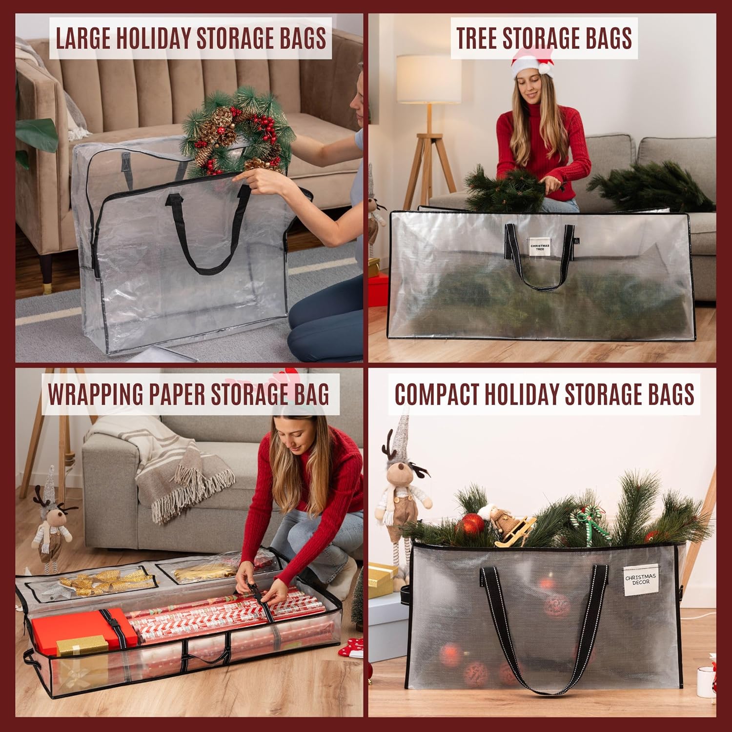 Keep your holiday decorations organized and protected year-round with our exclusive bundle! This set includes 4 multi-use clear wreath bags, a spacious 7.5 ft Christmas tree storage bag, a convenient gift wrapping paper storage solution, and 2 large storage bags. Each item is crafted from durable, clear material for easy identification and access. Perfect for maintaining the pristine condition of your festive gear!