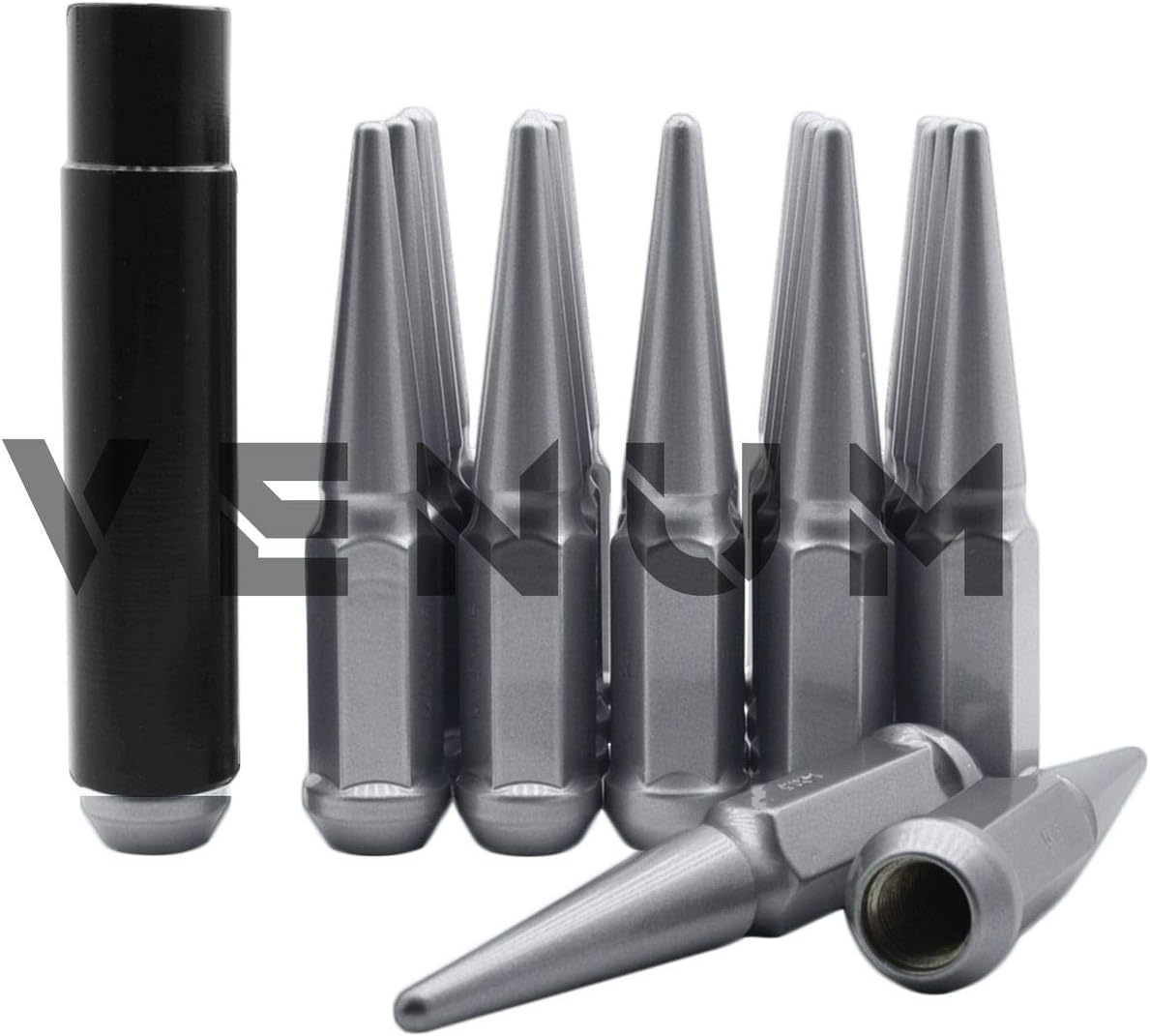 [ PRODUCT DESCRIPTION ] New 32 Pc Set of OEM Silver "SOLID SPIKE" Steel Lug Nuts. Fits all 14x1.5 vehicles with aftermarket wheels & conical seating. These lug nuts are not cheap ordinary lug nuts. Our lug nuts are powdercoated and made in house. We can customize any lug nut to any color. Spike Lug nuts are THE HOTTEST aftermarket lug nuts in the market. Made out of 10.9 Grade Steel, 1 Piece construction. These lug nuts require a special socket to install/remove them. At the same time it adds security to your wheels. Special key is included. [ COMPATIBLE WITH ] All Years Avalanche 1988-2000 C-2500 1988-2000 C-3500 1988-2000 K-2500 1988-2000 K-3500 1988-2019 Express Van 2500 1988-2019 Express Van 3500 1999-2019 Silverado 2500 HD 1999-2019 Silverado 3500 HD SRW & Dually 1999-2014 Suburban 2500 2003-2009 H2 2003-2005 Excursion 2003-2016 F-250 2003-2016 F-350 SRW & Dually 1988-2000 C-2500 1988-2000 K-3500 1988-2000 C-3500 1988-2000 K-2500 1999-2019 Savana 2500/3500 1999-2019 Sierra 2500 HD 1999-2019 Sierra 3500 HD SRW & Dually 2000-2019 Yukon XL 2500 2012-2020 Ram 2500 2012-2020 Ram 3500 & MORE [ IMPORTANT NOTES ] - Perfect For Aftermarket wheels - Will Work With Some Factory Wheels With Conical Seating Lug Holes (310) 763-0028