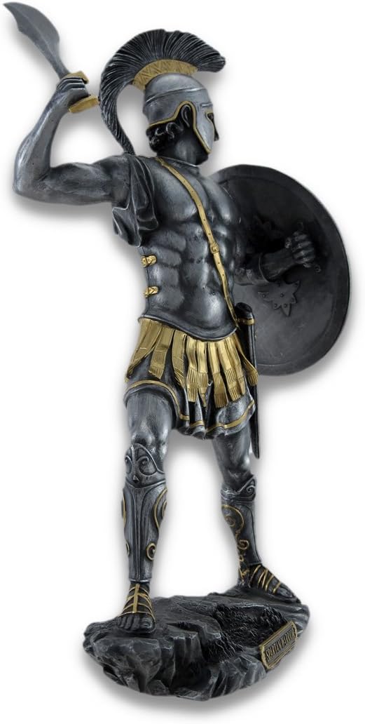 This statue depicts a Spartan warrior in full armor, sword in one hand and shield in the other, ready for battle. The Spartans were one of the most feared military forces in world history, and it was commonly accepted that `one Spartan was worth several men of any other state.` Made of cold-cast resin, it measures 13 inches tall, 7 inches wide, and 6 1/2 inches deep, and the bottom of the base is lined with felt to prevent it from scratching delicate surfaces. The silvered finish and gold accents emphasize the detail of the piece, from the texture of the warrior`s armor to his fierce facial expression. It makes a great gift for history buffs and looks wonderful displayed in your home or office.