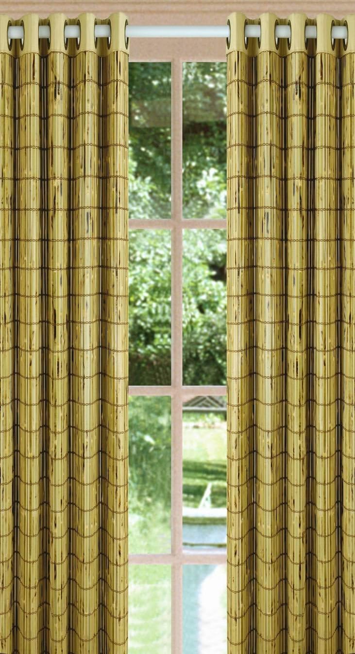 Natural & "Enviro" Bamboo Grommet Top Valance features 1-1/4in diam grommet mounting system. Rust Resistant Antique Brass grommets slide side to side for easy opening without the dangerous cords - pet and child friendly product. The look of Roman shade bamboo material and hangs like a standard curtain panel on a decorative drapery rod (rod not included). Clean with a vacuum or soft brush. This curtain covers 65in in width. This product is meant for Indoor use.