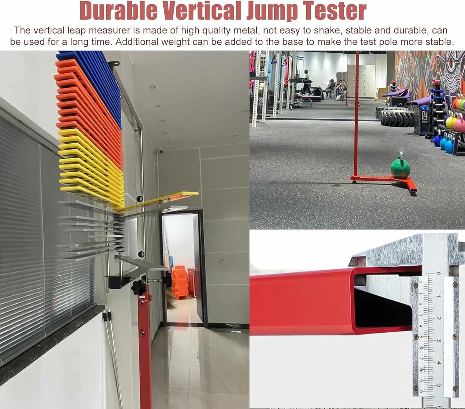 Vertical Jump Trainer, Height Adjustable, Floor-standing High Jump Training Equipment, Vertical Test, Jump Meter - Reset Pull Cord and Moving WheelSpecificationsProduct Name: Vertical Jump Tester- Material: MetalIs it Easy to Assemble: YesFeatures:- Suitable for athletes of various sports.- Improve the vertical jumping ability of each athlete.- Rounded corner design, anti-cutting hands, high toughness, anti-fall, no deformation.- Use the included pull cord to quickly and easily reset the tester.- Suitable for indoor and outdoor basketball, high jump, beach volleyball and related jump training activities.Tips:1. Due to manual measurement, there may be errors.2. Due to different shooting lights and monitors, there may be color differences. Please refer to the actual product.3. If you have any questions, please feel free to contact us. We will reply you within 24 hours. We will do our best to satisfy you.