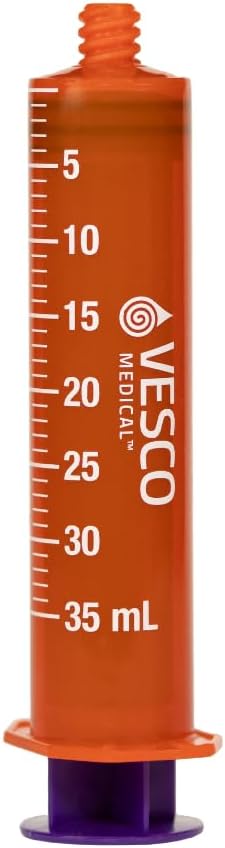 Vesco Medical ENFit Amber Syringes are single-use enteral syringes designed for various medical uses, such as tube placement, feeding, medication administration, and irrigation. They come in sizes of 5, 10, 20, 35, and 60 mL and feature printed graduated markings in milliliters. Each syringe includes a cap in its blister pack. These syringes are free from natural rubber latex, DEHP, BPA, and other phthalates. They are available in both clean/non-sterile and sterile versions, with the sterile ones sterilized via ethyl-o-xylene (EO), and should not be re-sterilized.