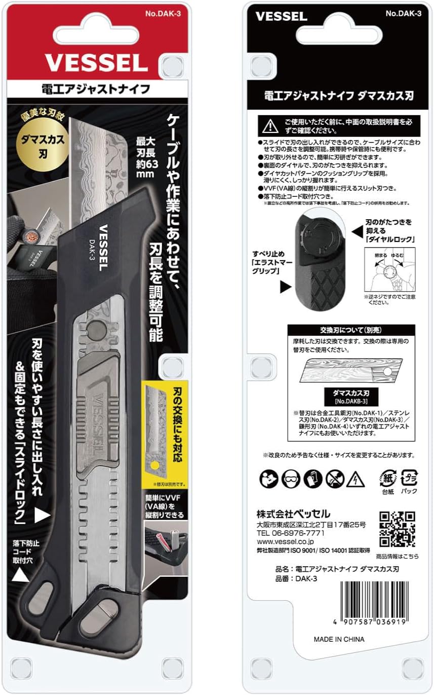 [Use] For stripping cables, cutting PF pipes, drilling holes in openings, etc. Features: Made of beautiful Damascus steel with a beautiful blade crest. Hardness and long lasting blade. The blade can be inserted and removed using the slide, so the length of the blade can be adjusted according to the diameter of the cable. It is convenient for carrying and storing in a compact package. The blade is removable, so you can easily replace and sharpen the blade. The dial on the reverse side reduces the rattling of the blade. Adopts cushion grip with diamond cut pattern. Elastomer resin for a non-slip grip Comes with a slit blade that allows you to easily divert the VVF (VA wire) vertically. Comes with a cord mounting hole to prevent drops.