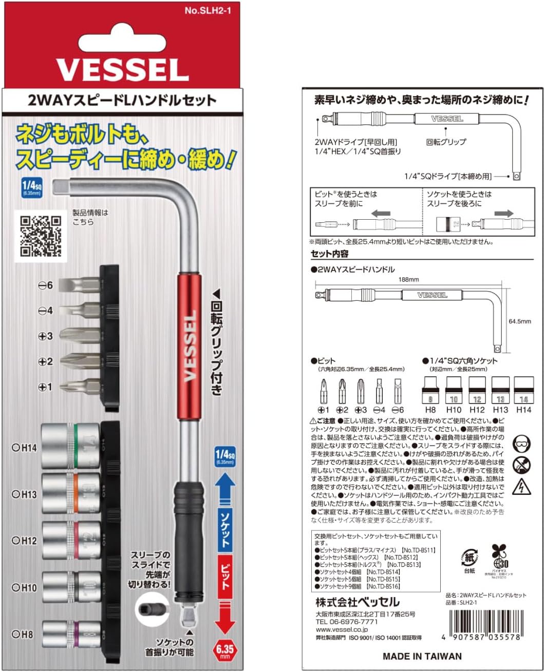 Features: A 2-way zipper that slides forward and allows you to use the socket with a bit, and a socket or bit. Oscillating drive & rotating grip for quick and easy turning. Tightening on the short axis. . [Use] For various maintenance, assembly, disassembly, and general work. . [Precautions] You cannot use both head bits and bits that are shorter than 1.0 inch (25.4 mm). . Specifications: Set Includes: Speed L handle (H6.35/SQ1/4) x 1 bit (+) 2 (+) 3 (-) 4 (-) 6 x 25.4 mm x 1 socket H8, H10, H12, H13, H14 x 25.4 mm x 1 each (holder) Material: [body] ASSY [socket] Cr-V steel [bit] bit material Bit Insert: 0.25 inch (6.35 mm) (hexagon). Socket insertion angle: 1/4 SQ (0.25 inches) (6.35 mm) Specifications: oscillating function (square tip drive) with rotating grip Package Size: 9.1 x 3.3 x 1.4 inches (230 x 84 x 3Weight: 4.1 oz (116 g).