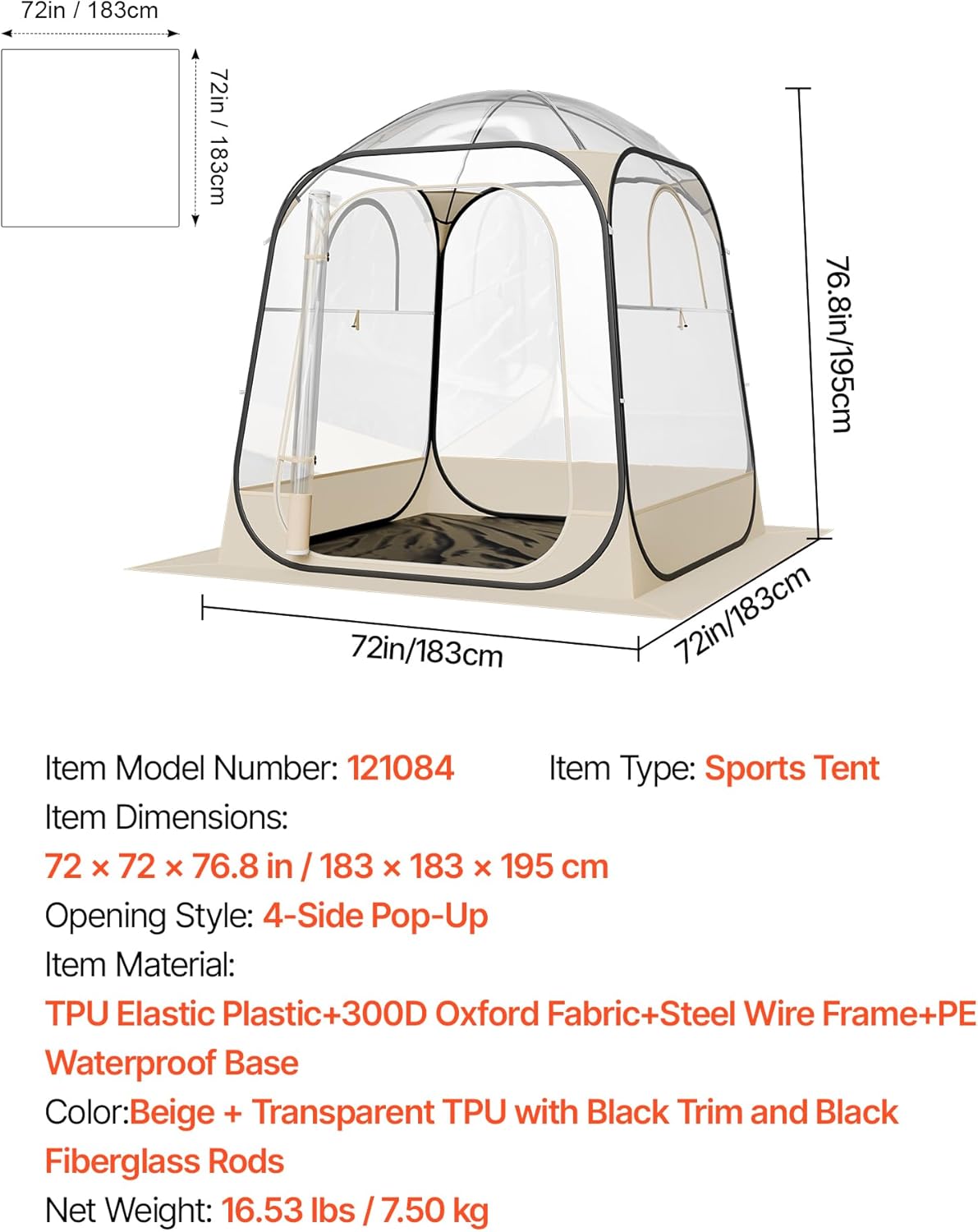 | Item Type Name | 72x72 in Clear Sports Tent for 2-4 Persons, Waterproof Outdoor Weather with Floor Mat & Top Cover, Garden Igloo Dome Tents Camping Shelter for Events Fishing Cheering |