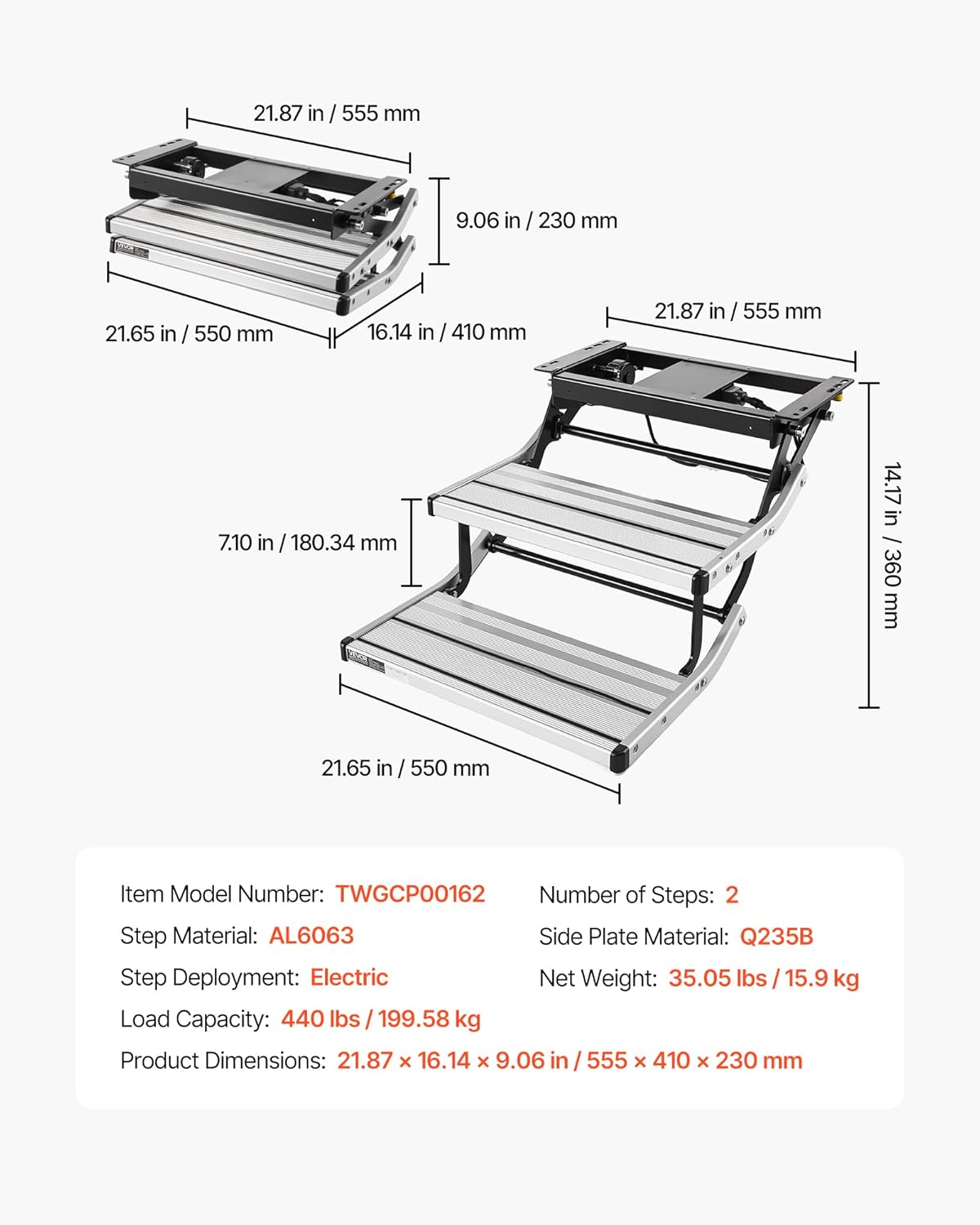 | Item Type Name | 2-Step, 440 lbs Load Capacity, Electric Retractable RV Stairs, Telescopic Folding Aluminum Alloy Camper Steps, Steel Frame Non-Slip Entry Stair for Camper Van Motorhome Travel Trailer |