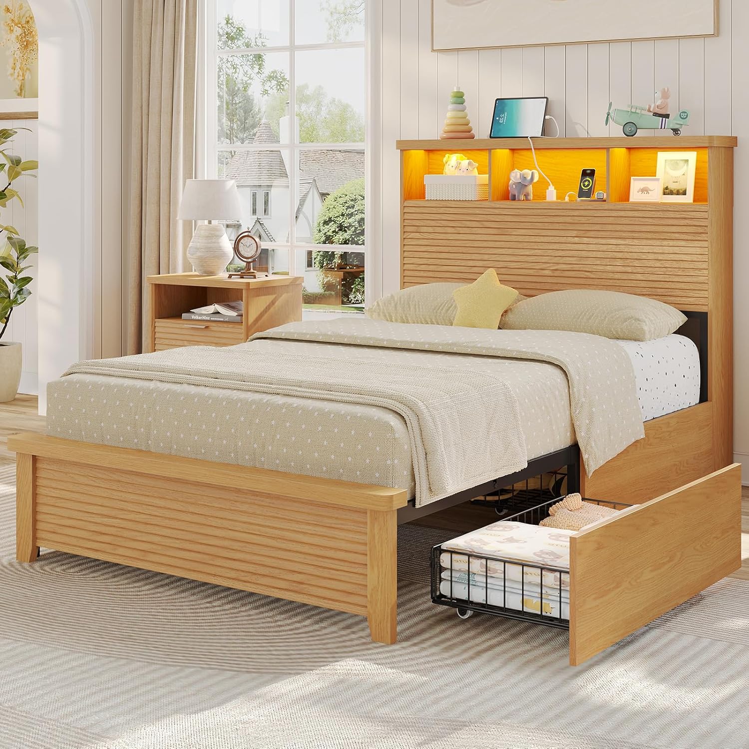 | Other Special Features of the Product | 2 Tier Storage Headboard, 4 Drawers, Charging Station, Fluted Design, Lighted, No Box Spring Needed |