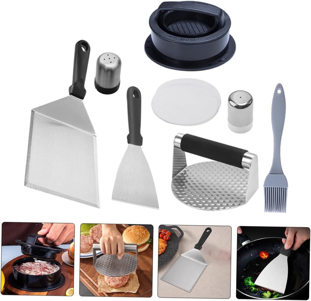 Package List 1 x basking brush 1 x stainless steel meat press 1 x hamburger press 1 x cooking spatula (large) 1 x cooking spatula(small) 100 x paper liners 1 x 5-hole pepper shaker, 1 x single-hole pepper shaker Features -Sturdy to use: made from stainless steel, the burger press and spatula are built to last, ensuring long term use barbecue accessories -Size:14.00X14.00X8.00cm/5.50X5.50X3.14in basting brush for cooking -Size:23.00X10.00X2.00cm/9.04X3.93X0.79in camping accessories -Material:Stainless steel, silicone burger press for griddle -Size:31.50X13.00X8.00cm/12.38X5.11X3.14in smash burger press kit -Ideal for outdoor activities: nice for outdoor grilling, camping, and barbecues, this tool set is a must have for cooking enthusiast food brushes for cooking -Easy to clean: both the burger press and spatula are designed for easy cleaning, making cleanup a breeze griddle spatula -Versatile cooking tool: this bbq tool set includes meat press, burger press, oil paper, spatula, etc., nice for grilling, frying, and cooking a variety of foods burger press -Color:Assorted Color flat grill accessories -Ergonomic design: the spatula features ergonomic handles that provide a comfortable grip metal spatulaGoods Descriptionpastry brush for cooking and baking The stainless steel burger press features a wide, thick plate that ensures even cooking.kitchen brush for cooking This BBQ tool set is designed to make your grilling experience effortless and enjoyable.grill accessories for outdoor grill The versatile cooking spatula can be used for frying, flipping, making it a must-have for any outdoor cooking enthusiast