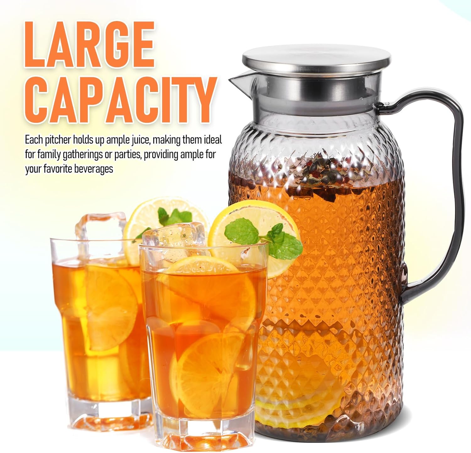 Package List 2 x juice jugs Characteristics -Product Info:Acrylic juice pot -Robust material: constructed from robust plastic, these juice bottles with caps are sturdy and resistant to breaking, ensuring they last for years -Transparent and stylish: the modern, clear juice pitcher with lid enhances the visual appeal of your drinks, making them look more enticing juice water jug -Versatile use: these plastic pitchers are not ; they are also suitable for storing tea, coffee, and other beverages juice jars with lids -Large volume: each pitcher holds up enough drinks, providing ample space for your favorite beverages, ideal for family and party use drink containers for parties -Capacity: 1.8L juice storage bottles -Color:Transparent -Material:Plastic -Simple cleaning: the plastic pitcher with lid is convenient to clean with its smooth surface, helping you maintain their great condition easily gallon water bottle -Size:24.00X11.50X11.50cm/9.43X4.52X4.52inGoods Descriptionpitchers with lids Their sturdy construction means they can withstand the rigors of outdoor activities while still looking stylish on your dining table.drink pitcher Enjoy your favorite beverages in style with these versatile pitchers.pitcher with lid Ideal for both indoor and outdoor use, these juice pitchers with lid are suitable for picnics, barbecues, and family gatherings