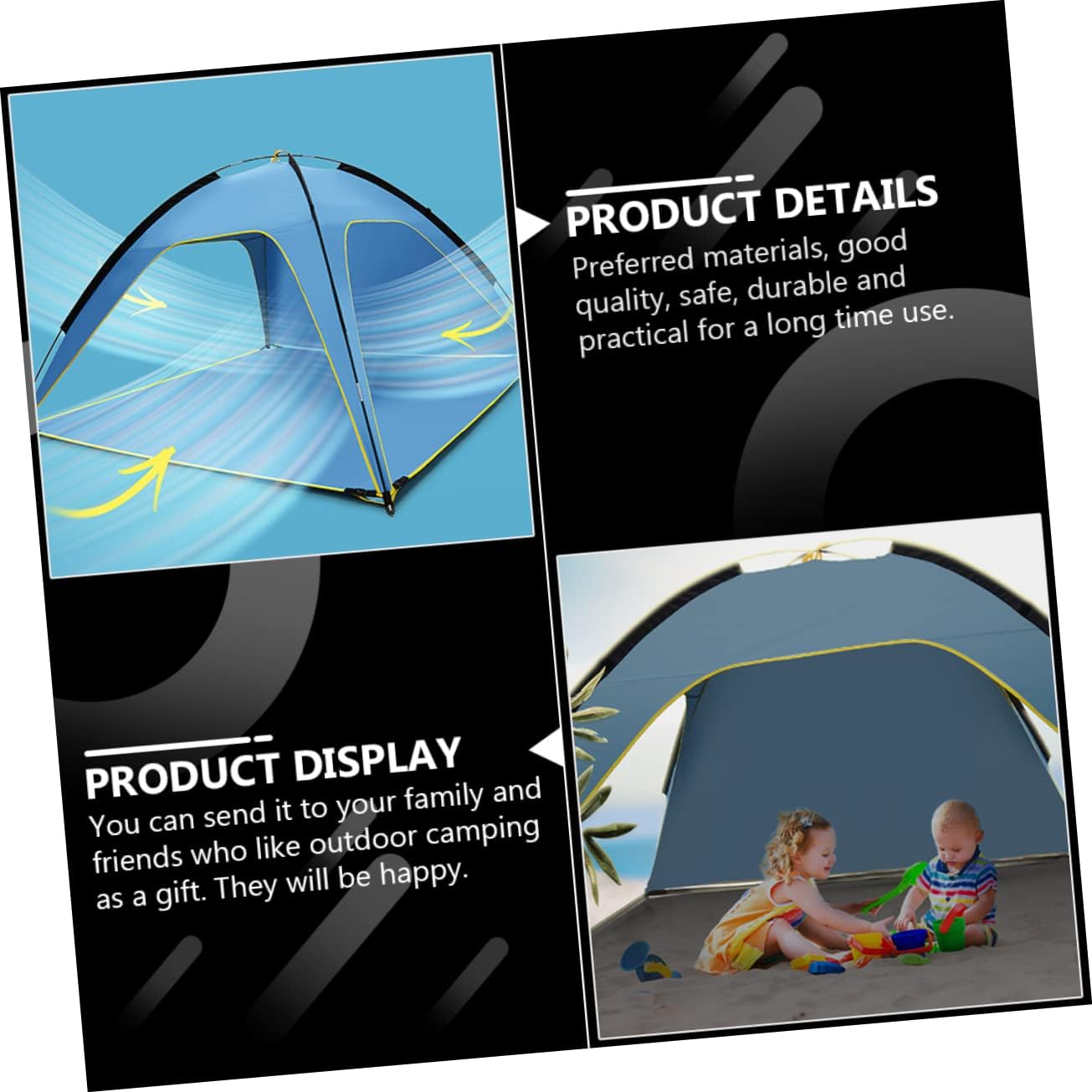 Package Include 1 Characteristics - Color: Sky-blue Rainproof Tent. - Material: Polyester Spacious Outdoor Tent. - Size: 210.00X210.00X130.00cm/82.53X82.53X51.09inch Ventilated Tent. - It is for outdoor activities such as camping and hiking, and can bring you convenience Big Tent Tarp. - The outdoor camping beach tent is great for both adult and , great for outdoor picnic Quick Opening Tent. - Made of and polyester materials, it to come Hiking Tent. - With the help of this outdoor tent, you can play and chat with your friend and parents happily Big Camping Tent. - tents have enough space for outdoor activities and entertainment and are more Sunscreen Tent.Goods InformationQuick Opening Tent If you are looking for a professional and outdoor tent, then your research is over here.Big Tent Tarp Adopted of material, it is and for long time use.Camping Accessories It is for outdoor activities such as camping and hiking, and can bring you convenience.Foldable Tent That's because our product can meet your need.Beach Tent It is easy to use and bring you much convenience