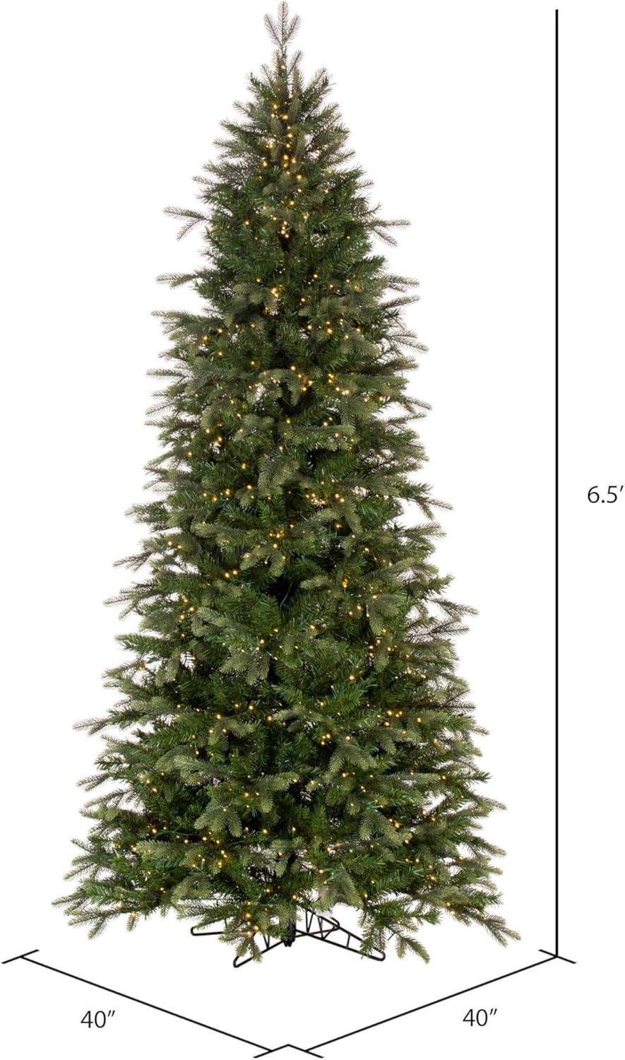 Vickerman 6.5' x 40" Prelit Douglas Fir Artificial Slim Pre-Lit Christmas Tree featuring 1652 PE/PVC tips and 950 warm white wide angle LED Dura-Lit® lights. This incredible tree is made of a lush blend of PE and PVC tips on metal hinged branches, it comes prelit with Dura-lit lights, is easy to assemble, a convenient on/off step switch to control the lights, and a Metal tree stand is included. This tree features Dura-lit® Lights that utilize microchips in each socket so bulbs stay lit even when some bulbs are broken or missing. Make a statement in any room around your home with this full Douglas Fir tree. This durable tree is maintenance-free and recommended for indoor use, measuring 78" H x 40" W x 40" L. Product may ship condensed in transit, fluffing of the branches may be required to reach your desired look. Enjoy this expert-designed Douglas Fir Tree around your home while creating new memories and celebrating traditions with family and friends this Christmas. For additional complimentary accents see the many wreaths and garlands available from Vickerman. Vickerman has been an industry leader in quality, design and manufacturing since 1940.