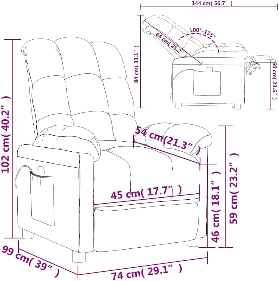 Sit back and drift away in this highly comfortable massage chair!Manual reclining function: The reclining chair is specially designed with 3 reclining positions so that you can adjust the backrest and footrest manually as per your comfort.Vibration function: The featured 6 massage points let you experience a better-targeted massage. Additionally, the included hand control allows you to pick different massage programs. The massage function is powered by the USB connector, but the certified 5V USB power source is not included.Comfortable seat experience: The thickly padded seat, backrest, and wide armrests covered in fabric provide a cozy and warm sensation, making you feel embraced while seated. The fabric features a simple and clean look, and is breathable and durable.Solid and stable frame: The frame made of wood and metal provides a strong structure and stability. This reclining armchair is comfortable and durable.Color: Light grayMaterial: Fabric (100% polyester), metal, solid wood, plywoodFilling material: Sponge, PP cottonSitting dimensions: 29.1" x 39" x 40.2" (W x D x H) Lying down dimensions: 29.1" x 56.7" x 33.1" (W x D x H)Seat dimensions: 17.7" x 21.3" x 18.1" (W x D x H)Includes a USB and remote controlWith side pocketVoltage: DC 5 VOptions: Massage without heatingType of massage: 6-point vibration massageAdjustable headrest and footrestAssembly required: YesCalifornia Proposition 65 –:: – .