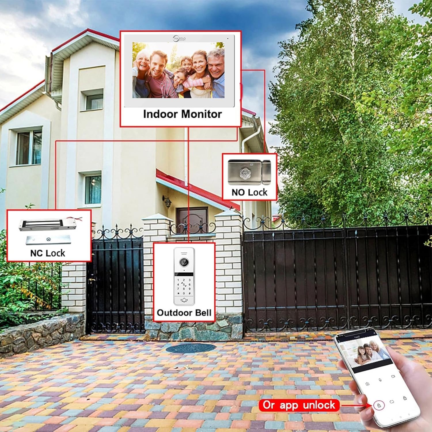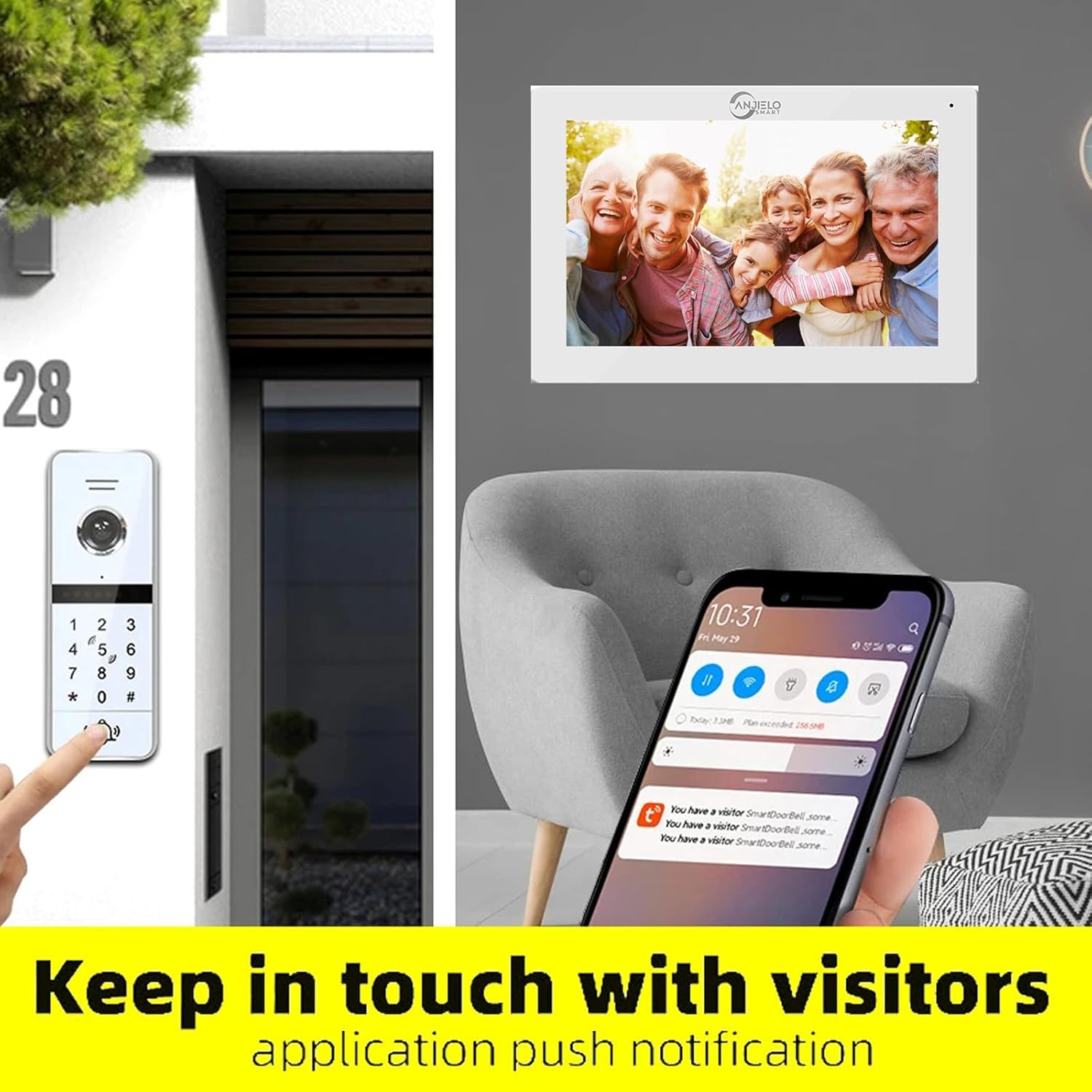 Camera Sensor:1080P View Angle:130º Power Supply:Supplied from indoor monitor Material:Aluminum alloy panel Waterproof :IP65 Weatherproof Istallation :Surface mount Indoor Touch Monitor: Screen: 7 inch TFT-LCD touch screen Resolution: 1024 x 680 Ring: 7-chord melody rings Volume,color: Adjustable Connection way: 4-wires, WIFI TUYA solution Panel Material: Acrylic/ABS cover Installation: Surface mounting Input voltage:AC 100-240V 50/60Hz Working voltage:DC 12V, 2A Size: 7.8×5.1×0.8 inch / 198x130x21 mm NOTE: 1.Please note the wifi video intercom system not mean it's don't need any cable. The monitor support WIFI network,but the indoor monitor and doorbell is Wired. 2.The monitor support WiFi network(only connect with 2.4GHZ router band), easily setup video doorbell by connecting to wifi via the Tuya app. 3.The indoor monitor and doorbell is Wired connection. You can use RVV4/Cat5/Cat6 wires to extend the monitor to doorbell, or monitor to monitor according to your need,mounting in your desired location. maximum distance can exceed 300ft. 4.Supports 5 mobile phones to share, APP free. Support 2 doorbell, 6 indoor monitors. Can be connected to all electronic locks.