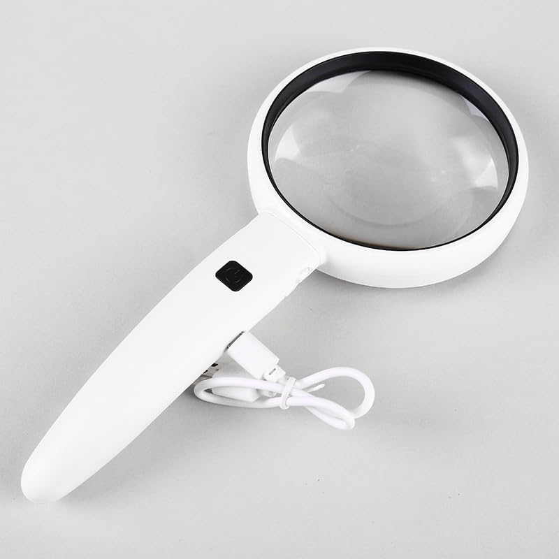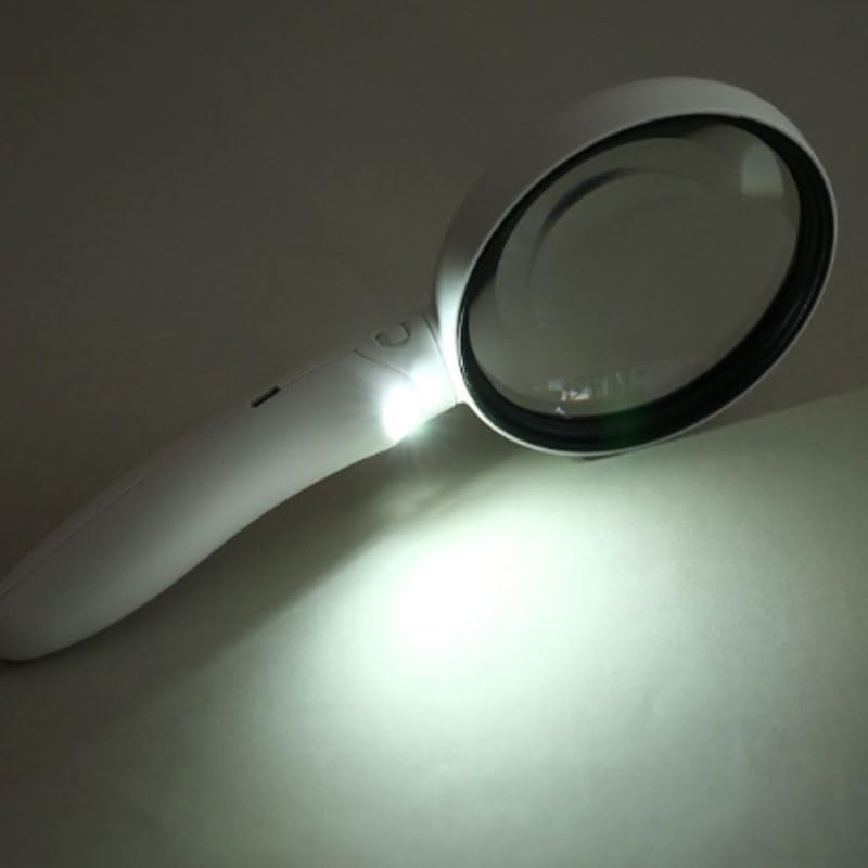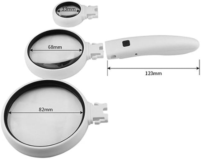 Specifications:: Handheld MagnifierMaterial: ABS plastic, acrylic optical lensColor: WhiteSize: 223 * 100 * 30mmDiameter: 90mm, 75mm, 37mmHandle length: 123mmLens diameter: 82mm 68mm, 33mmMagnification: 3.5X, 5X, 11XLight source: 2 LED lightsPackage Contents:3 interchangeable lenses1* handle1 * wiping cloth1 * Chinese and English instruction manual(Excluding other demonstration products)Note:Due to the light effect, the actual color of the item might be slightly different from the color showed on the pictures. Please allow 1-2cm measuring deviation due to manual measurement.for inspecting stamps/coins, lightweight easy to hold (or hands-free ), with optional for dim environments, solving blurry vision troubles and boosting work/study/leisure convenience