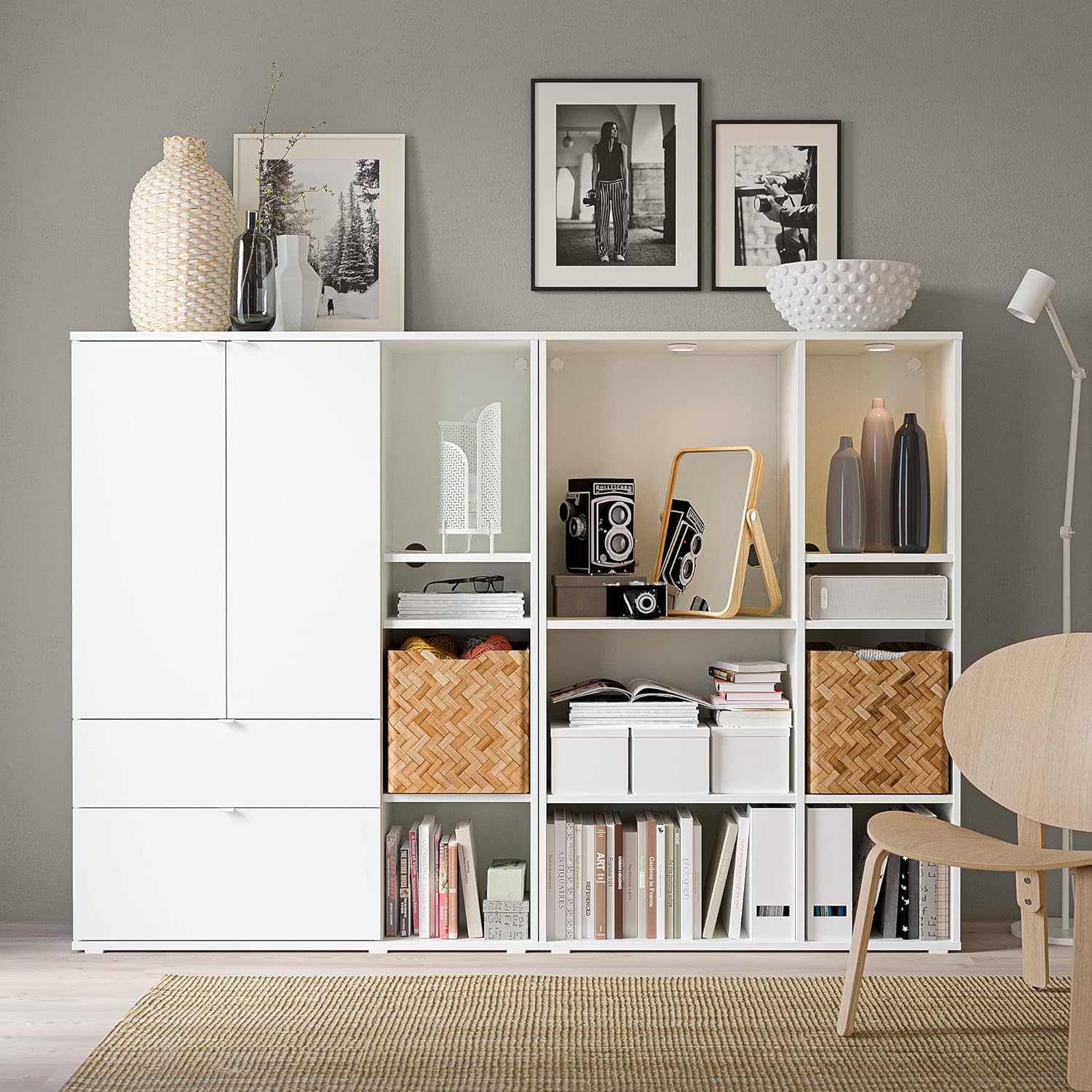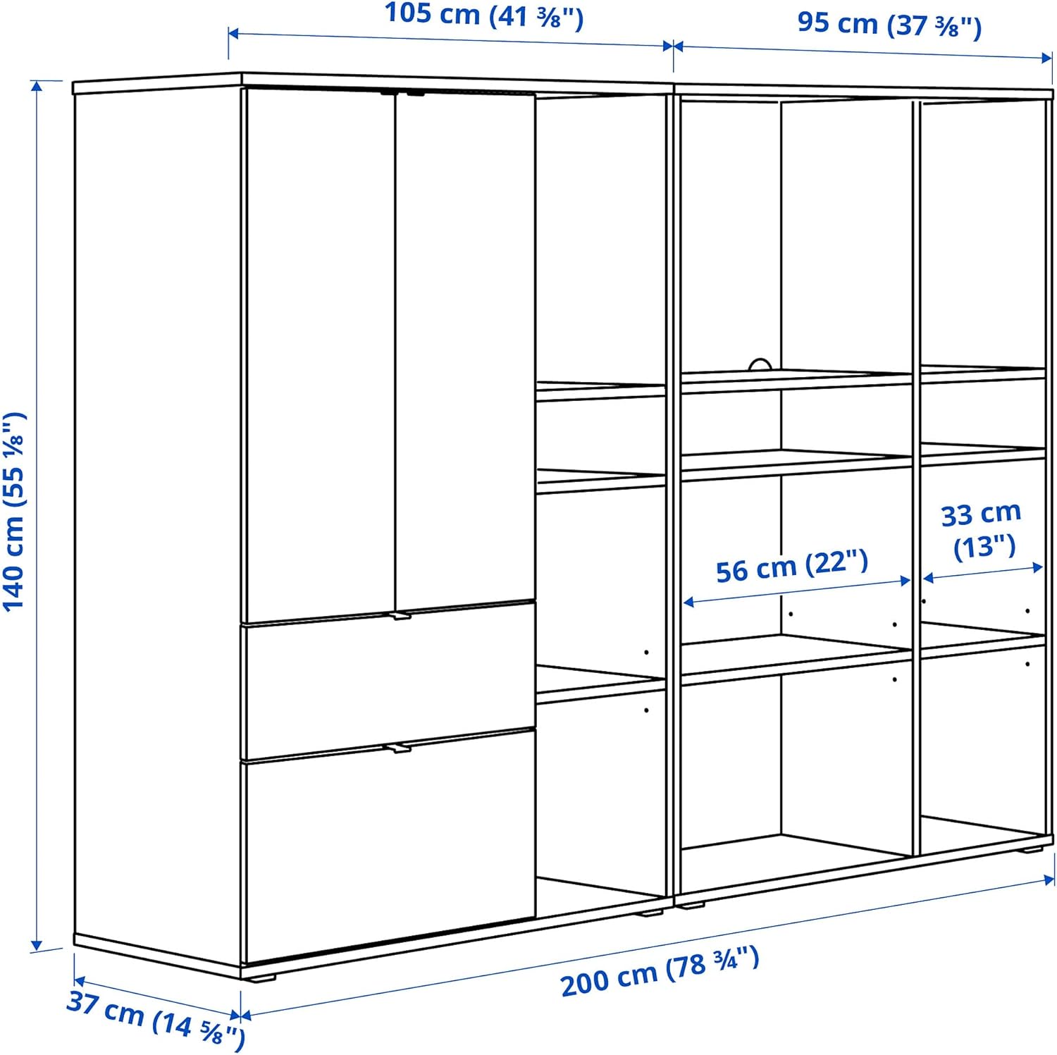 Key Features:Suitable as a practical all-in-one storage solution if your living space is small and you need to store clothes, things for your home office and personal belongings in the same place. Hide messy cables from chargers, devices and decorative lighting by leading them through the outlets in the back. Personalize your VIHALS storage with boxes, lighting and things you like. 2 different-sized drawers help to organise your things. You get a seamless look when combining 2 or more VIHALS units as the fixed shelves align. The clean and simple design is easy to pair with different furniture styles. The frames are easy to assemble thanks to the clever construction with wedge dowels that are conveniently pressed into the pre-drilled holes. The majority of the materials used in VIHALS come from renewable sources.Assembled Size:Depth: 37 cmHeight: 140 cmWidth: 200 cmMax. load/small shelf: 9 kgMax. load/large shelf: 15 kgImportant note: For customers ordering from outside of EU, please note, you may be subject to import duty and tax. Please check with your postal or tax office on your import regulations