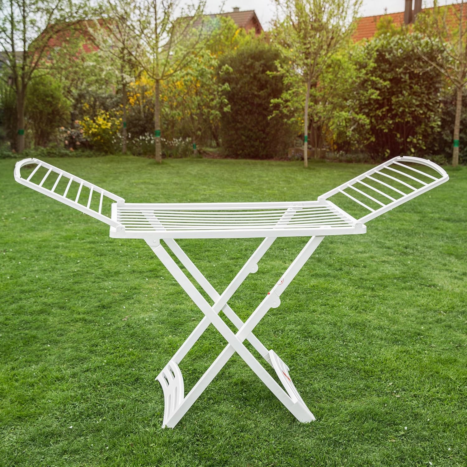 Vileda Solar is the ideal product for outdoor tumble drying. Thanks to 100% plastic, it is particularly weatherproof and UV-resistant. Its special base frame construction provides extra stability. Thanks to the wheels and the safety button to prevent accidental closing, the drying rack can be moved easily and safely even when fully loaded. Dimensions when open (L x W x H): 182 x 55 x 88 cm. Dimensions when closed (L x W x H): 55 x 10 x 126 cm.