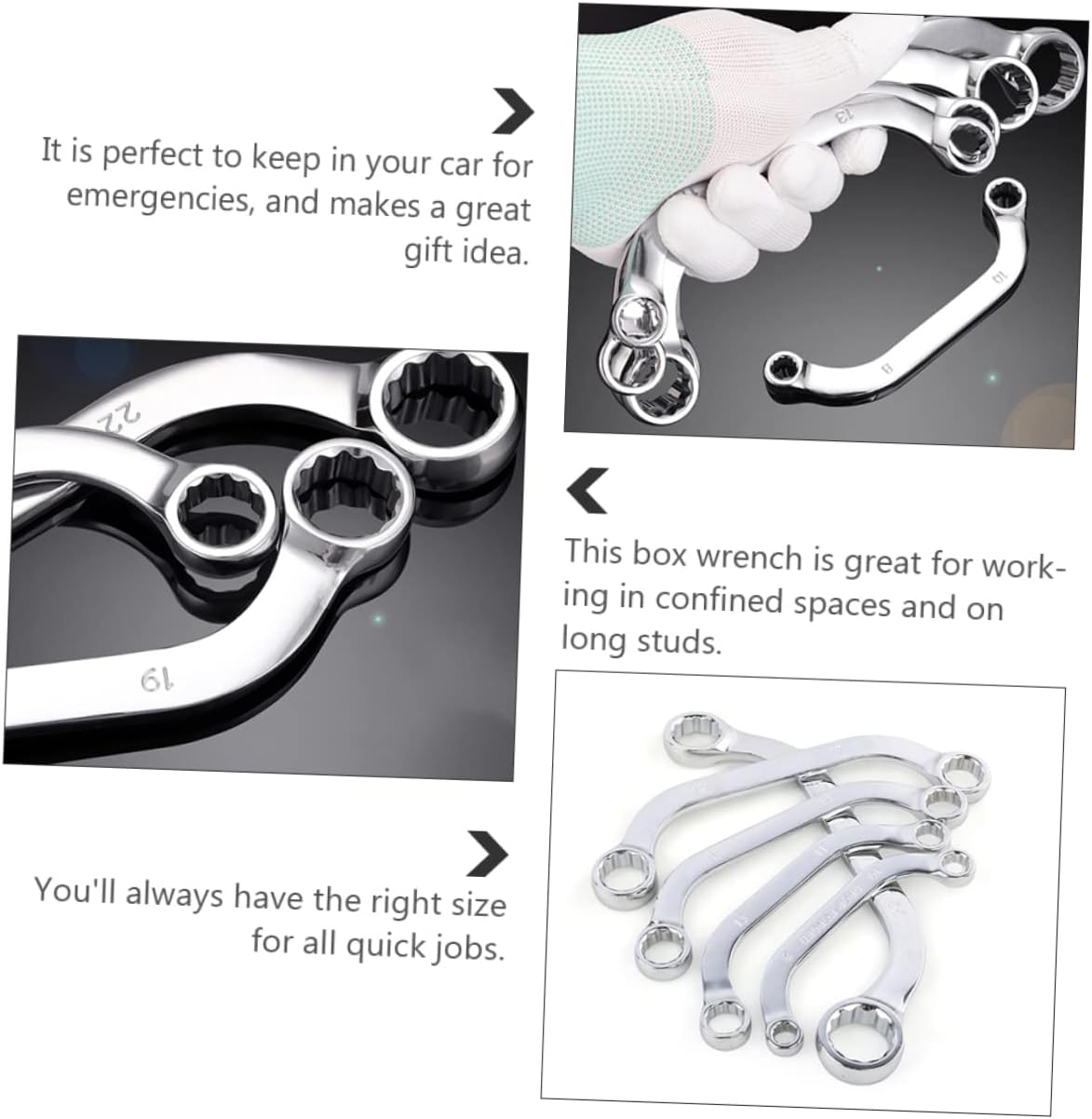 Package Include 5 x wrenches Features - Material: Chrome-vanadium steel Multi-functional Wrench. - Size: 31.00X30.00X2.20cm/12.18X11.79X0.86 inch Steel Multi-functional Wrench. - Color: Silver Metal Multi-functional Wrench. - Our box wrench is made of high grade chrome-vanadium steel that is heat-treated for strength and durability socket wrench. - This box wrench is great for working in confined spaces and on long studs Steel Socket Spanner. - It is to keep in your car for emergencies, and makes a great present idea socket wrenches. - Each tool is tested against industry standards for hardness, torque, finish and usability and should last a under normal use multifunction wrench tool. - The box wrench is for use in tight spots. You'll always have the right size for all quick jobs. c spanner wrenchGoods DescriptionMetal Socket Wrench Are you looking professional, yet box wrench? Are you in search of a sturdy, trustworthy tool that can do multiple jobs at once? , ! Our wrench must meet you needs.multifunctional wrench It is one of for you