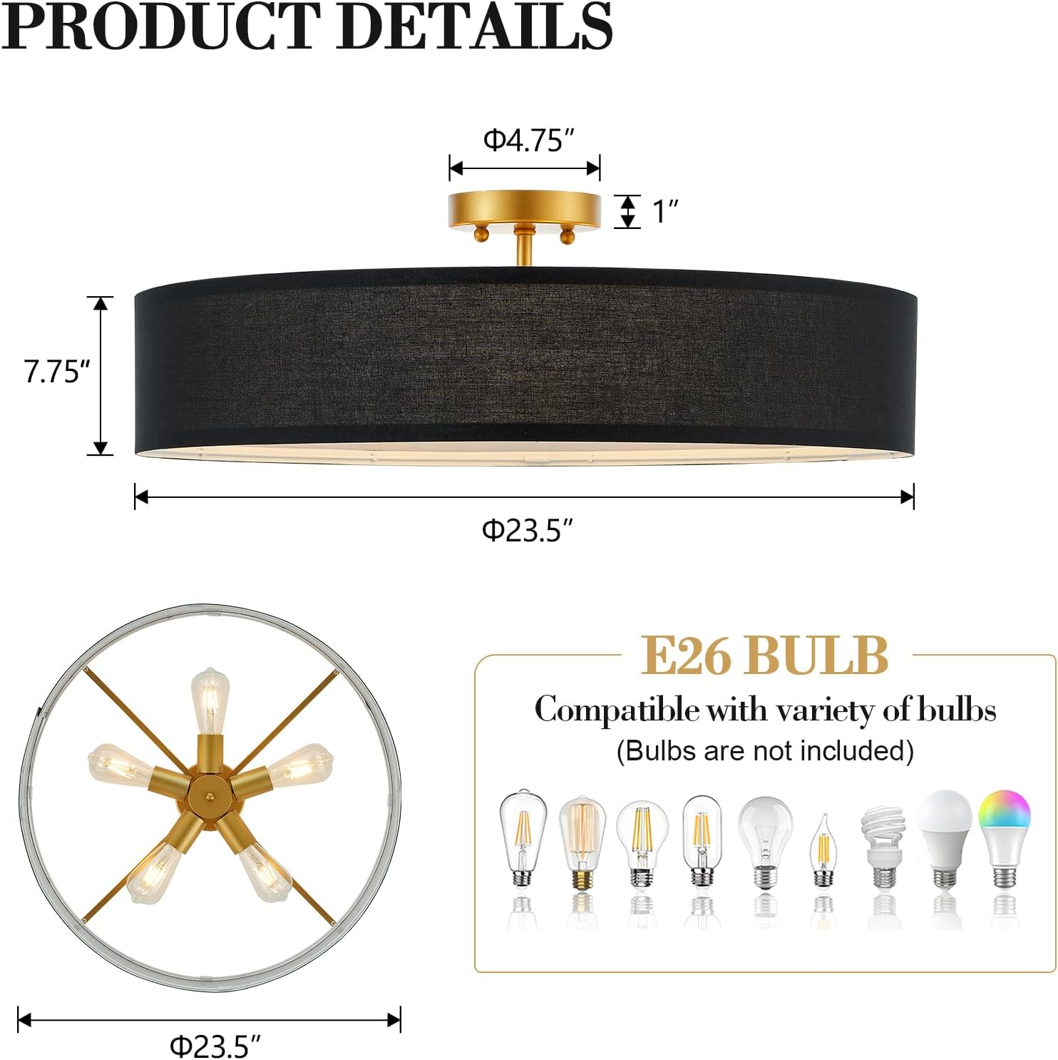 Semi-Flush Mount Ceiling Light Fixture with Black Fabric Shade