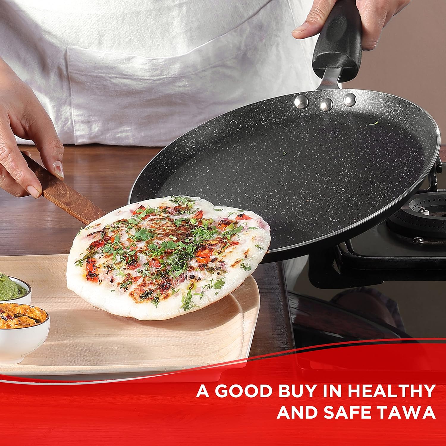 Vinod Zest Marbilo Non stick Dosa tawa is made up of 5 layer coating, making it more durable than ordinary non-stick cookware. Itâs special spatter-coated surface looks new for longer and is free from harmful chemicals like PFOA. The thick aluminium helps you cook food without burning and is extremely durable. This tawa comes with triple riveted Bakelite handle which is heat resistant and durable. As it is non-stick, there is no grease build up. A soft sponge with some soapy water is enough. Additionally, because of its scratch-resistant coating, you can use metal spoons without peeling the external coating off. This non stick tawa is both gas stove and induction compatible and is dishwasher safe as well. Make crispy dosas, uttapams, chillas, french toasts, rolls, omelettes, pizzas and much more. Its unique coating ensures crispy, tasty oil-free delicacies every time. Additional Information Base Gas Compatible and Induction Compatible Material Non Stick Dishwasher Safe Yes Package Content 1-Piece Tawa Warranty Details 24 Months Warranty