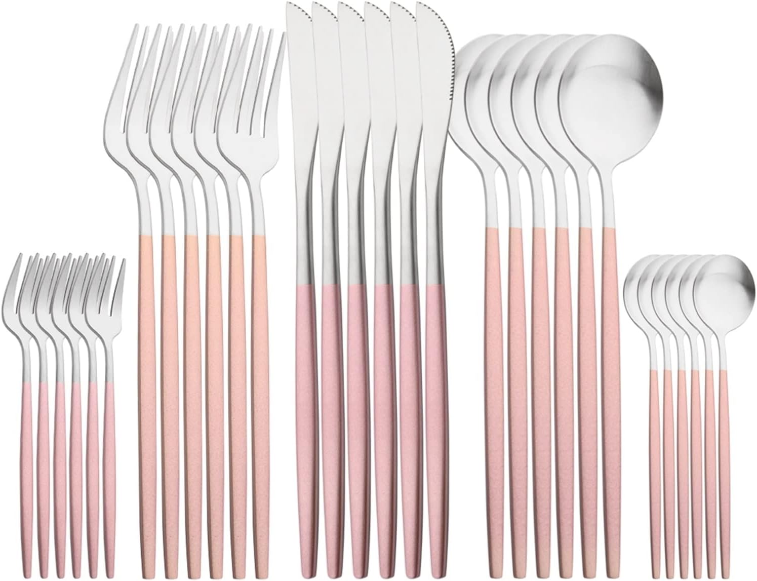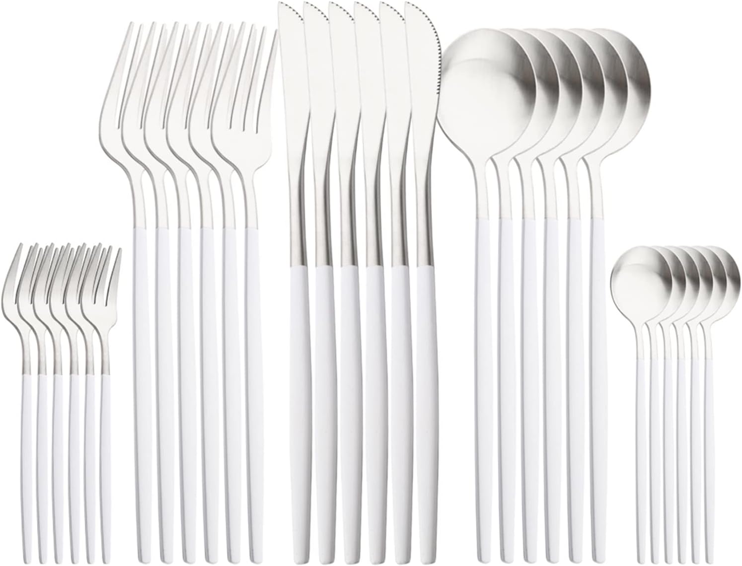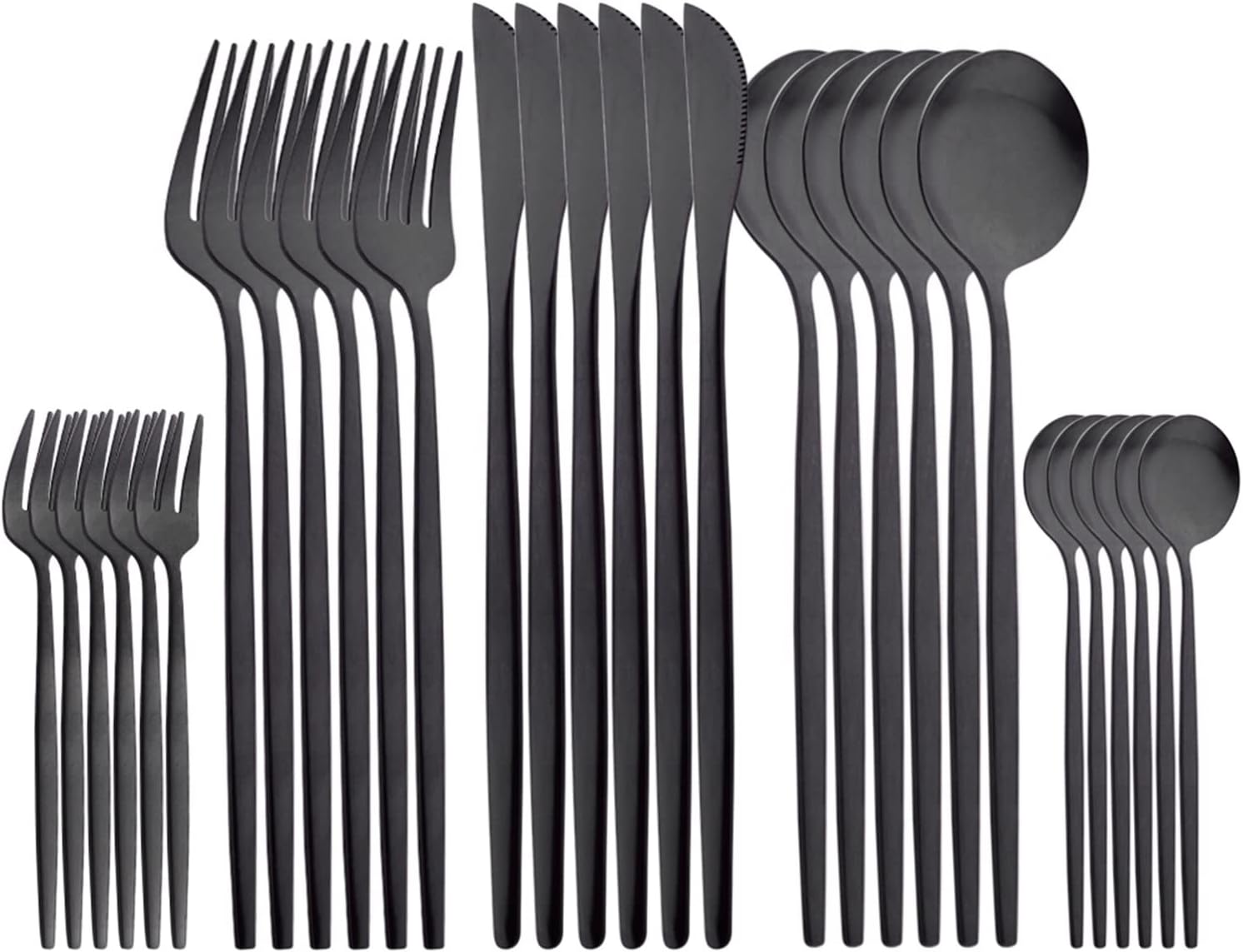 Product informationMade of Stainless Steel material,dinnerware is sturdy and durable. Easy to use and clean - Dishwasher safe;Suitable for use in Home,Party,Hotel,Restaurant,Gift,Birthday,camping travel.About SizeDinner Knife Length: 22cm/40gDinner Fork Length: 21.5cm/30gDinner Spoon Length: 21cm/40gTea Spoon Length: 13.5cm/10gDessert Fork Length: 18.5cm/20gDessert Spoon Length: 18.5cm/20gCake fork Length: 13.5cm/10gLong Ice Spoon Length: 21cm/18gAbout cleaningUse neutral detergent to flush it, Pls never use strong alkaline or strong oxidizing chemicals wash them. After cleaning your flatware, Please make it dry and keep the tableware clean and dry.About UseThe dinnerware are suitable for family party,outdoor picnics, hiking, trips and office use,also a great gift choice for your families and friends.NotesDue to the difference between different monitors, the pictures may not reflect the actual color of the item.Compare the detail sizes with yours, please allow slight difference due to manual measurement.Welcome to my shopHappy shopping
