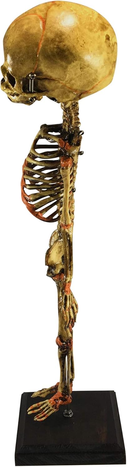 The Freak Show is in town! This Asylum Zone original vintage deluxe human Siamese fetus skeleton is a perfect addition to any oddity or oddities collection or American Horror Story inspired display. Purely for display purposes! Very creepy and very awe inspiring. This is a product hand painted and assembled in the USA. Features Has a dark brown stain to give it a vintage medical specimen look (faux vintage finish) Lacquer satin finish Solid wood stained base 14 inches tall (sitting on metal pole display adds 1-2 more inches) and can be removed from base Made of hard plastic Heads, legs and arms detach (joints do not bend) ”Y” shaped spine accommodates two heads for a deluxe look unlike our economy version which has a "V" shaped neck Jaws open (suspended with metal springs) Very minor assembly required Check out our other economy Siamese Twin Skeleton listing