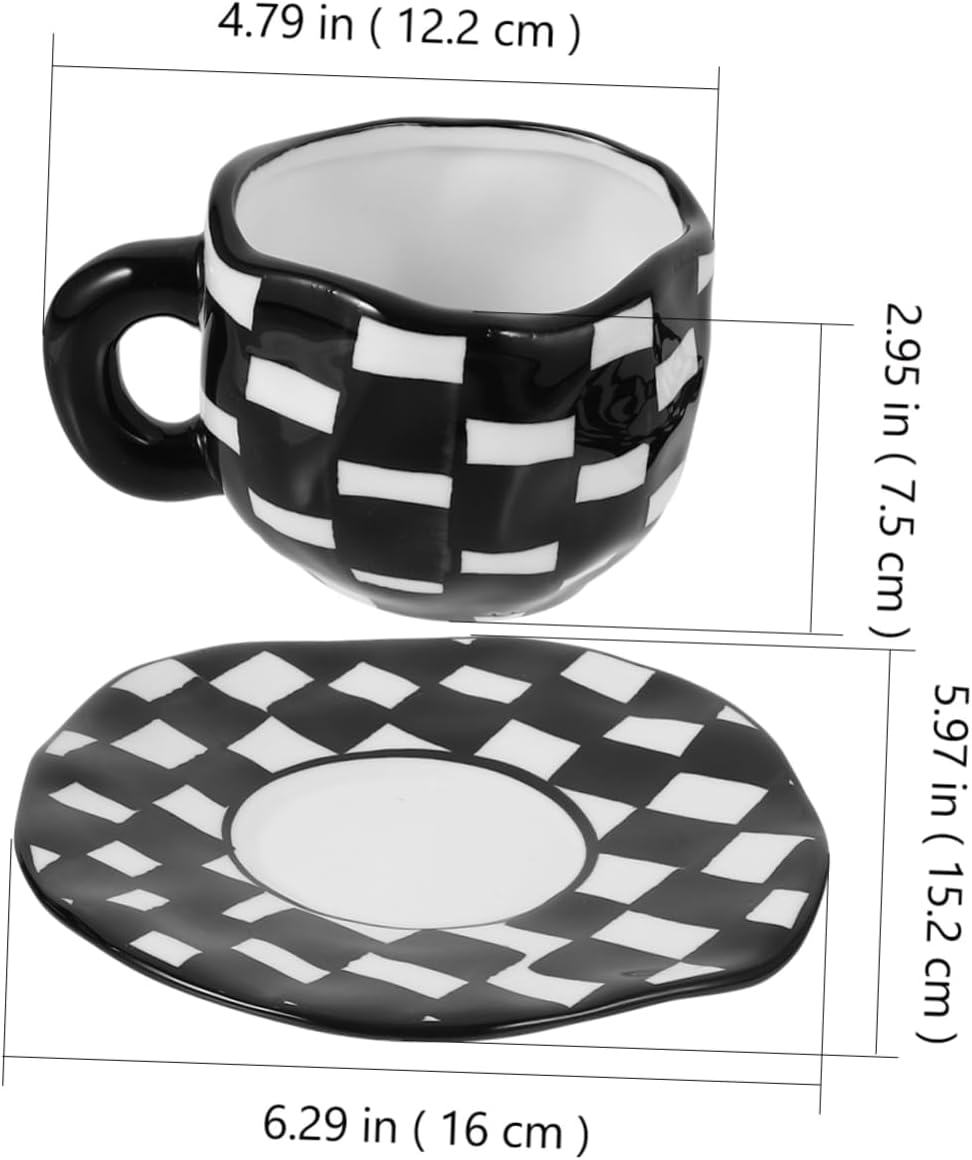 Package List 1 × saucer 1 × cup Features -Material:Ceramic Ceramic Mug -Color:Black coffee cups -Size:12.20X9.00X7.50cm/4.79X3.54X2.95in (Cup) milk cup -Size:16.00X15.20X1.00cm/6.29X5.97X0.39in (Saucer) Delicate Milk Cup -The product is suitable for a lot of places, such as home, coffee shop, book bar, restaurant etc Cartoon Coffee Mug. -Decorated with simple design, this coffee cup is beautiful and , safe and assured use Plaid Coffee Mug. -The coffee mug will bring you a happy mood with it adorable and checkered pattern on it Checkered Coffee Cup. - Coffee Cup can be used to drink coffee, tea and other drinks, and easy to maintain daily use coffee cup. -This Ceramic Cup design of convenient handle and smooth rim, it will bring you a great experience handle coffee mug.Goods Information water cup This practical water cup, which is made of reliable material.Home Ceramic Mug The bottom of the mug is smooth and thick, will not damage the desktop, which is very practical and convenient.Coffee Mugs Enjoy your morning cup of coffee in a simple style.Anti-scalding Handle Milk Mug It is anti-skidding, heat-resistant and easy to clean.Household Coffee Cup Checkered style, creative and practical to use