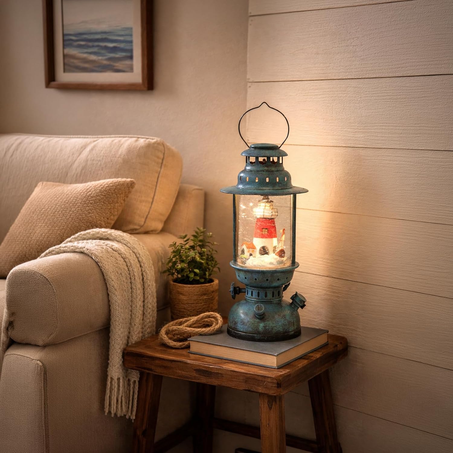 Bring coastal charm and warm illumination to your home with this beautifully crafted vintage style lighthouse water lantern. Designed with an antique aqua blue finish, this lantern features a detailed lighthouse scene surrounded by charming seaside elements that instantly evoke the feeling of ocean breezes and coastal escapes. The interior is filled with swirling water and shimmering glitter that continuously moves when the lantern is turned on, creating a captivating and soothing visual effect that makes the lighthouse look as if it is glowing with life. The built in LED lights enhance the brightness and ambiance of the scene while keeping energy use low. Because it is fully battery operated, you can place it anywhere in your home without worrying about outlets or visible cords. Perfect for tabletops, shelves, entryways, mantles, or workspaces, this lantern adds a touch of warmth and character to any area. Whether you are decorating a beach themed home, looking for a unique nautical accent piece, or searching for a thoughtful gift for lighthouse lovers, this LED water spinning lantern is a standout décor item that elevates any room. Its gentle illumination and constantly swirling water effect bring a relaxing and comforting glow that makes your space feel inviting and full of charm.