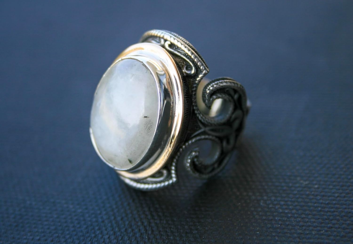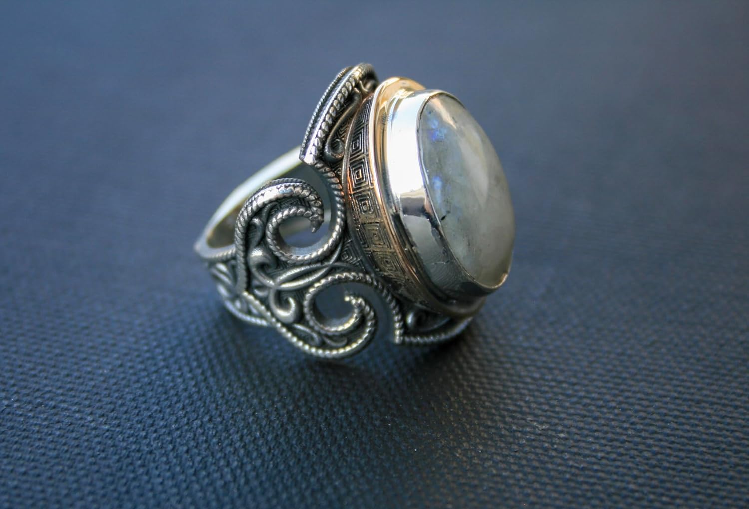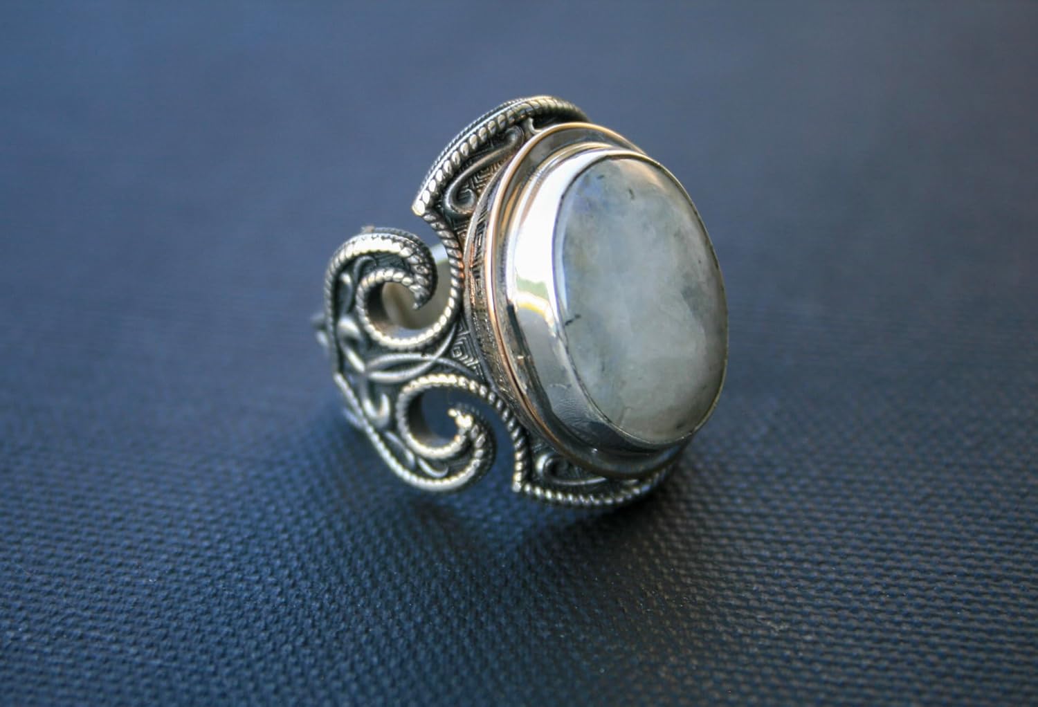 This vintage-style statement ring features a natural rainbow moonstone set in a solid 925 sterling silver band. With a weight of 20–24 grams, it's a substantial and elegant piece that radiates mystical charm. Moonstone is celebrated for enhancing intuition and emotional balance. As a natural gemstone, each piece is unique in its glow and character, making it a meaningful gift for anyone drawn to its calming energy and timeless beauty.