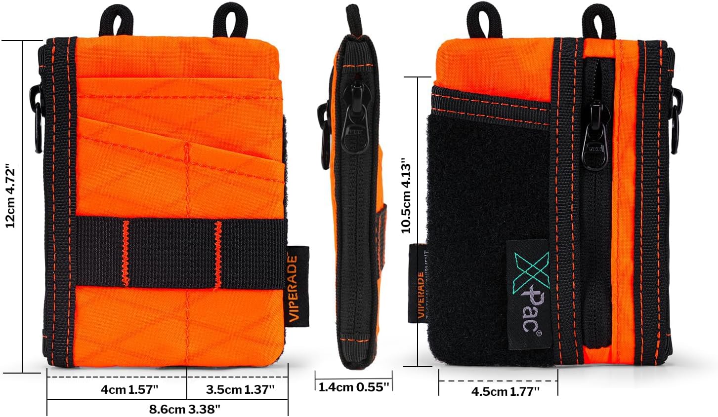 | Pocket Description | [The product has 3 pockets: 2 EDC slots on the front, a large front pocket for a thin cased phone or notebook, and a back pocket for a multi-tool or folding knife. Additionally, there are 2 zippered pockets that can hold cards, change, cash, and more.] |