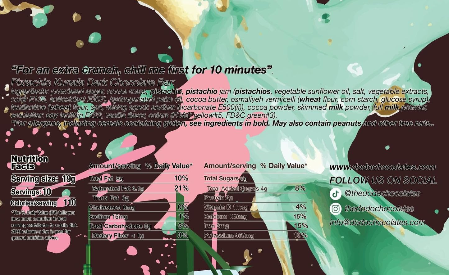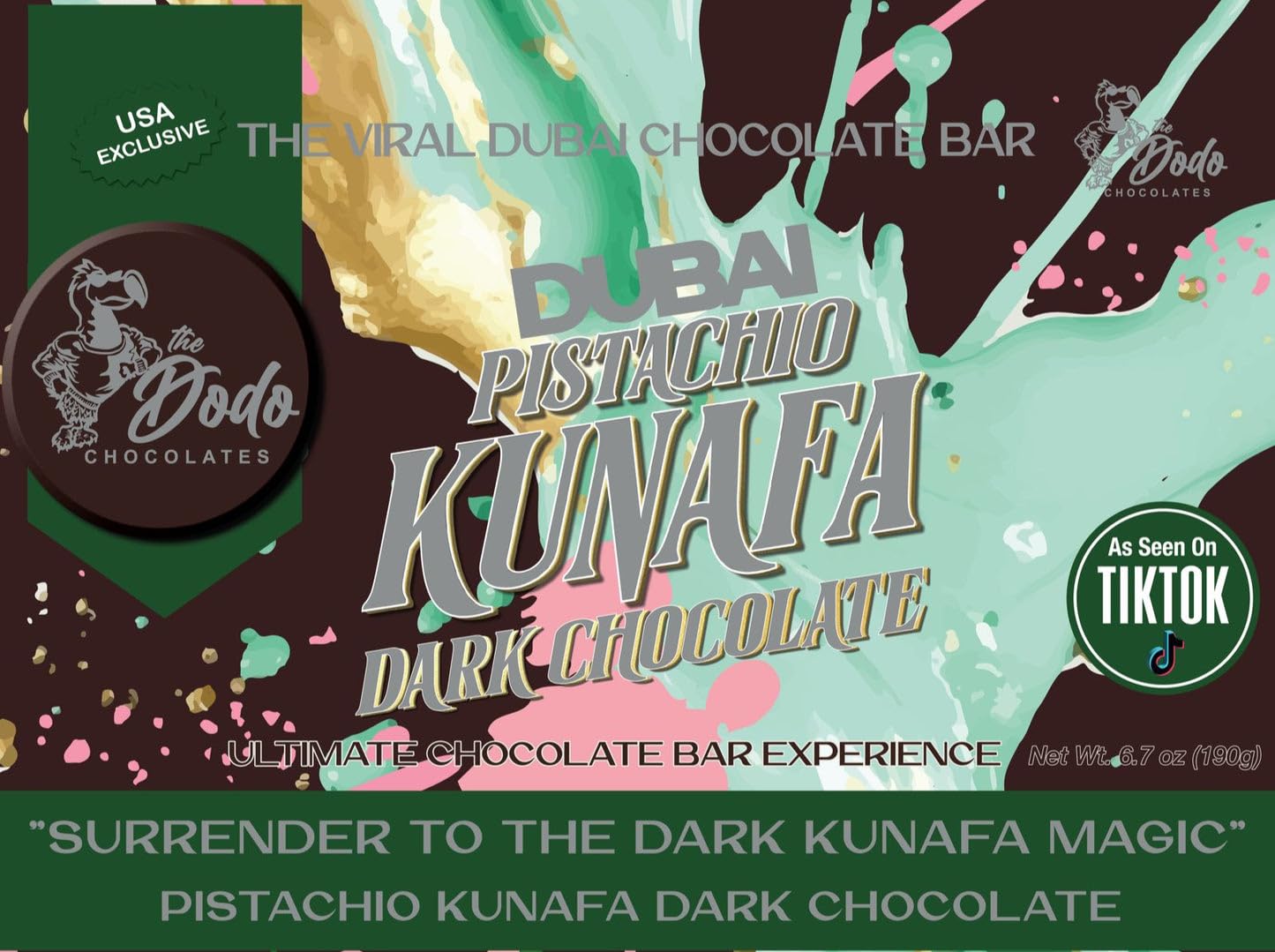 Exclusive Viral Dark Chocolate Pistachio Bar imported from the Middle East! The Dodo Chocolates Dark Chocolate Pistachio Kunafa Ultimate Chocolate Bar is made specifically for dark chocolate lovers everywhere! This decadent treat is a masterful fusion of rich dark chocolate and the craveable crunch of premium pistachios and Kunafa pastry inspired by the beloved Middle Eastern dessert. Handcrafted with care in the Middle East, this 6.7 oz chocolate bar delivers an unparalleled taste experience that’s sure to transport you to the heart of Dubai’s vibrant culinary scene.