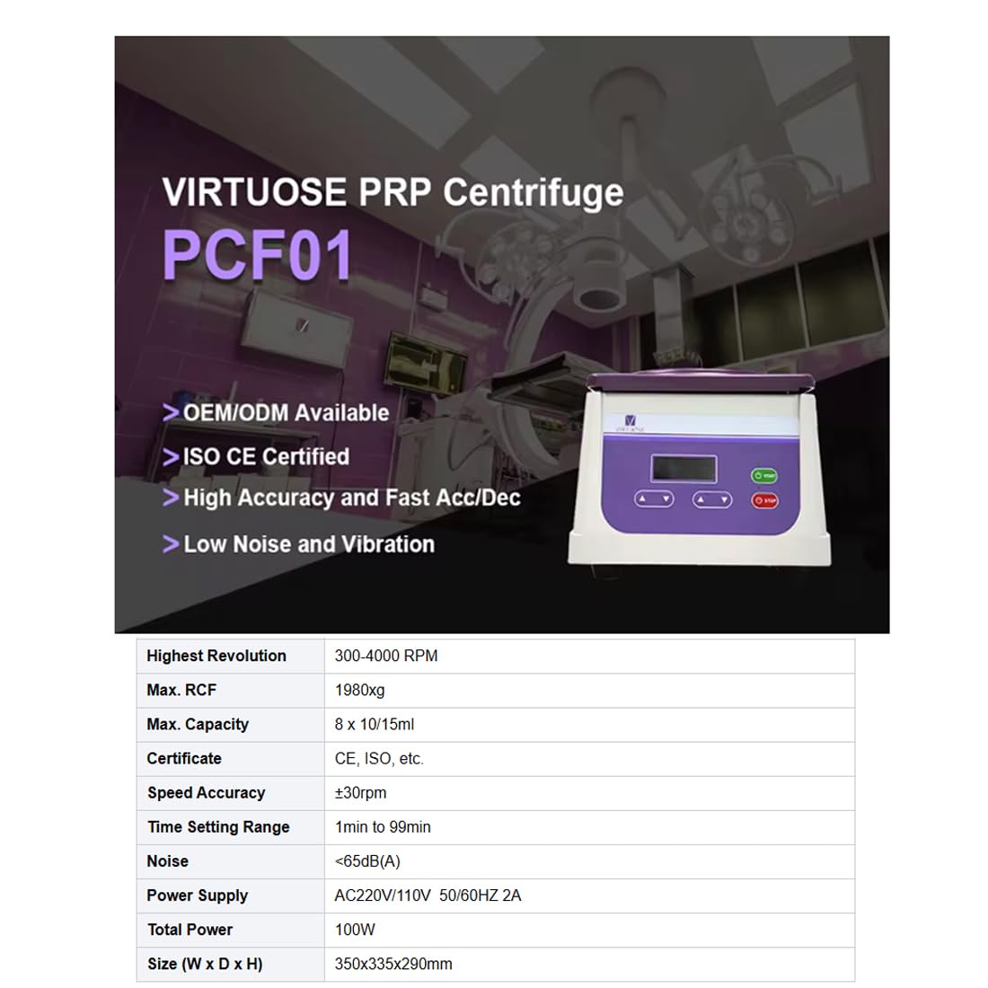 VIRTUOSE Professional PRP Centrifuge Machine 8 x 10ml/15ml, 300-4,000RPM(Max. 1860xg), with Time and Speed Control, Noise≤65dB.110V,LED Display Digital Betchtop Centrifuges