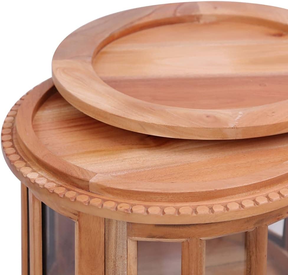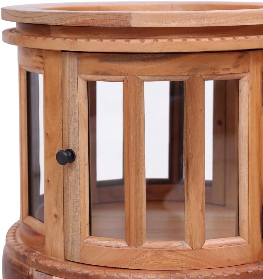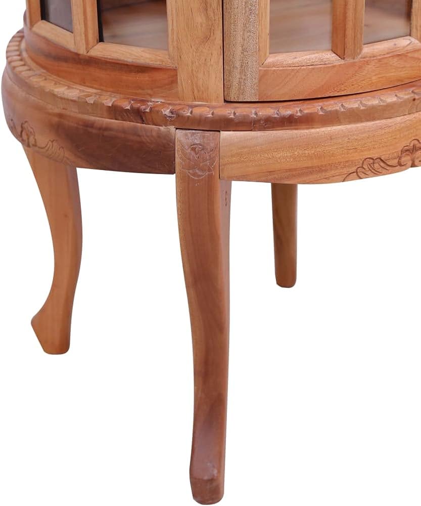 Bring the luxury of incense burner inspired design into your interior with our elegant wooden vitrine cabinet! Our side cabinet will make a practical as well as decorative addition to your interior.Made of solid mahogany wood with classical brown finish and glass, this solid wood vitrine cabinet is exceedingly durable and sturdy. Mahogany is a tropical hardwood, standing out with its beauty, durability and color. The couch table offers storage space with 1 large compartment. Additionally, the sturdy tabletop is ideal for displaying decorative objects, photo frames, potted plants, as well as various other items. It is easy to wipe clean with a damp cloth. The side cabinet is easy to assemble.Color: NaturalMaterial: Solid mahogany wood with natural finish + glassDimensions: 19.7" x 19.7" x 29.9" (L x W x H)With brass knobsWith 1 tray, 2 doors and 1 compartment