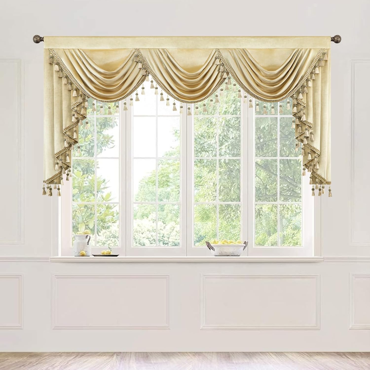| Additional Features | Handmade Tassel Trim, Light Filtering, Retro European Style, Rod Pocket Header, Super Soft Velvet Fabric |