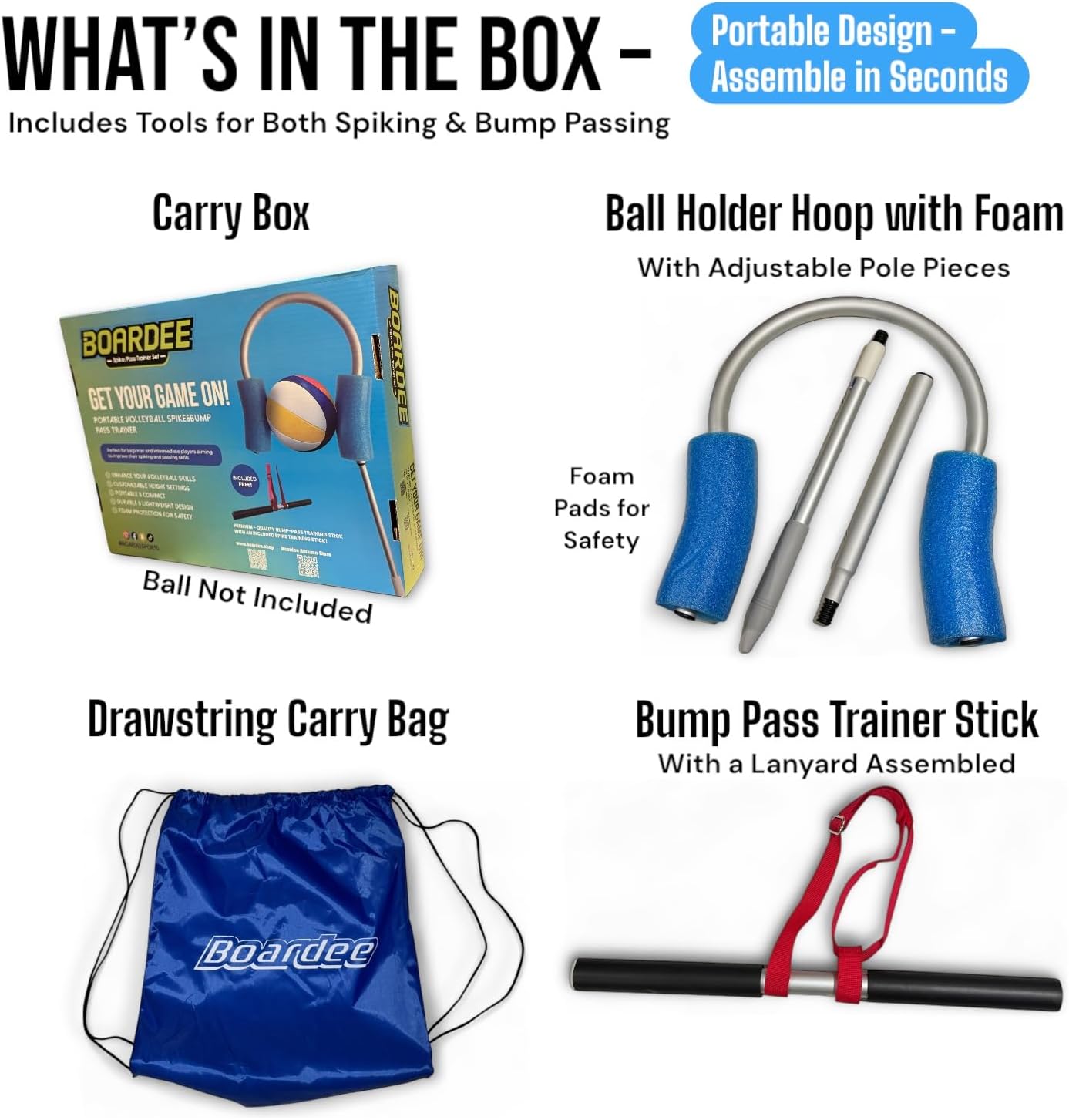 | Included Components | 1 x Boardee Drawstring Carry Bag, 1 x Bump/Pass Training Stick with Red Strap and Black Foam Padding, 1 x Carry Box, 1 x U-Shaped Aluminum Ball Holder with Safety Foam for Spike and Serve Training, 2 x Foldable Aluminum Extension Poles for Adjustable Height |