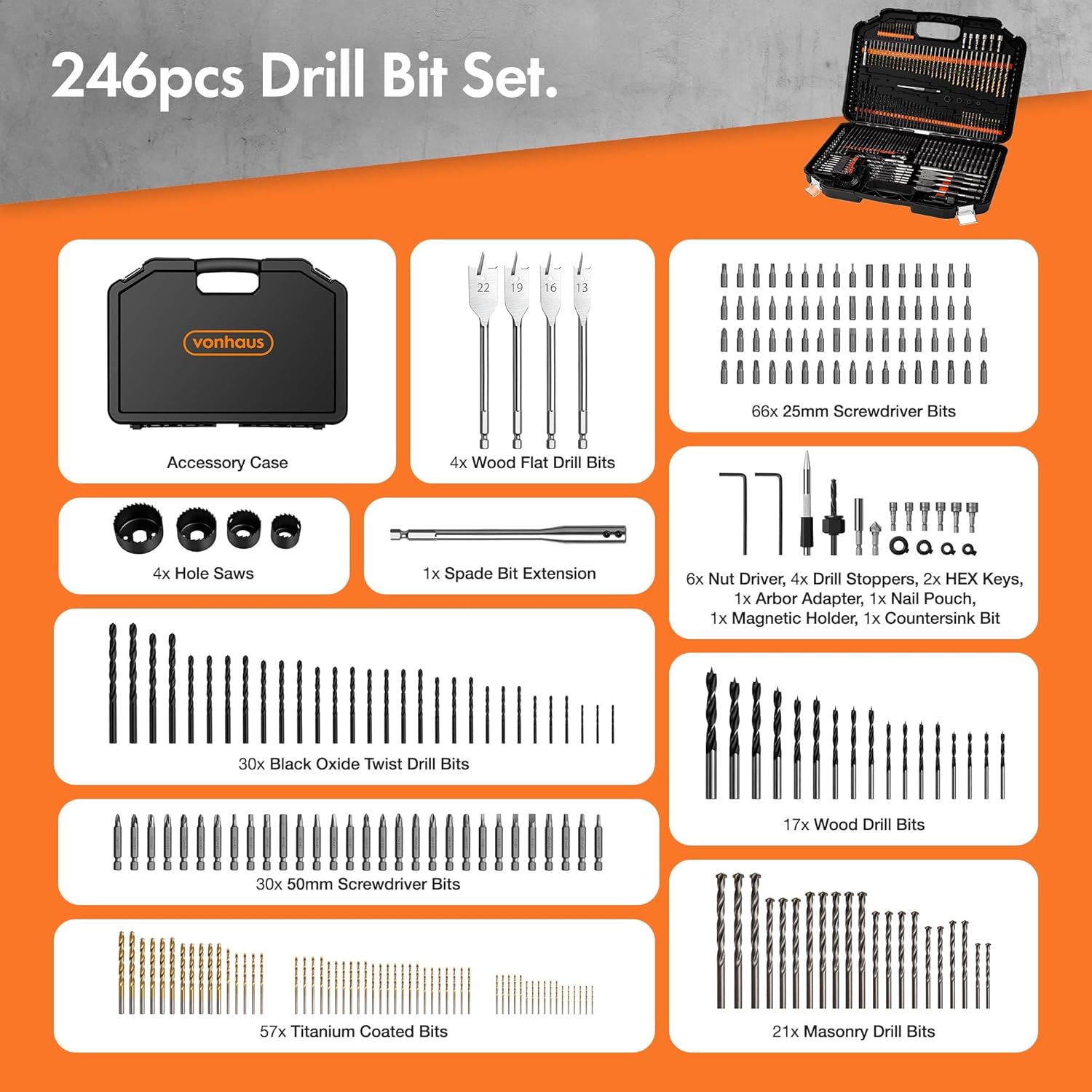 VonHaus 246 Piece Drill Bit Set Always have the right piece for the job with this complete set of 246pc drill bits from VonHaus. Whether you use a manual screwdriver or a power tool, there is something suitable for every application in this all-inclusive collection. Designed to deliver maximum cutting speeds and clean, precise drilling, the tough, heavy-duty bits deliver superior results. Heavy duty carrying case The set comes in a sturdy storage case with tips methodically arranged in molded placeholders, so you can locate exactly what you need at a glance. Complete set includes: 57 pieces HSS titanium twist drills: 1mm x 6, 1.5mm x 6, 2mm x 6, 2.5 x 6, 3mm x 7, 3.2mm x 6, 3.2mm x 6, 3.5mm x 4, 4.0mm x 4, 0.0.0.09 177 mm x 4, 5.5mm x 2, 6mm x 2, 6.5mm x 6mm. X 2 30pcs Black Oxide HSS Twist Drill Bits: 1.0mm X 3, 1.5mm X 3, 2mm X 3, 2.5mm X 3, 3mm X 4, 3.2mm X 3, 3.5mm X 3, 4mm X 4, 0.0.0.09 217 inches X 2 & 6.5mm X 2 17 pieces wood drill bits: 3mm x 4, 4mm x 4, 5mm x 3, 6mm x 2, 7mm, 8mm x 2 and 10mm 4 x flat wood drill bits: 13mm, 16mm, 19mm, 22mm. 1 x spade extension: 6" 21pcs Masonry Drill Bits: 3mm x 2, 4mm x 2, 4.5mm x 2, 5mm x 2, 5.5mm x 2, 6mm x 3, 6.5mm x 2, 7mm x 3, 8mm In, 0.35 4 mm, 10 mm. 4 x Drill Caps: 3mm, 5mm, 6mm, 8mm 66 x 25mm Screwdriver Bits: 10 x Slot, 12 x Phillips, 12 x Pozi, 8 x Stars, 6 x Hex Inch, 6 x Metric Hex and 12 x Square 30 x 50mm screwdriver bits: 4 x slot, 7 x Phillips, 7 x Pozi, 4 x star, 4 x metric hex and 4 x square 6 x Nuts: 6mm, 7mm, 8mm, 9mm, 10mm, 11mm 2 x 2.5mm Hex Key 1 x Countertop Sink 1 x Countertop Sink 4 hole saws: 32 mm, 38 mm, 45 mm and 54 mm. 1 x Shaft Adapter 4 hole saws: 32 mm, 38 mm, 45 mm and 54 mm. 1 x Hole Saw Shaft Adapter 1 x Nail Cutting Punch 1 x Bit Holder Universally compatible with all VonHaus drills and many other brands including Bosch, Makita and DeWalt.