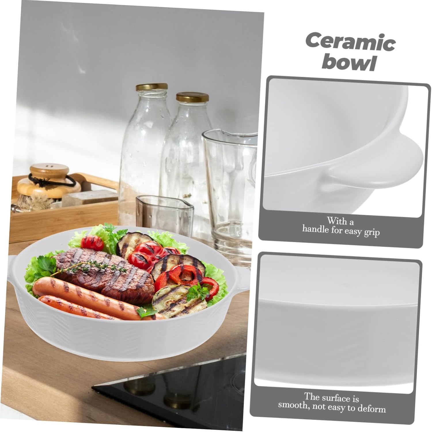 Package Include 1 x Baking Dish Features - Color: White deep baking dish -Material:Ceramic ceramic baking tray - Size: 30.50X25.50X5.00cm/11.99X10.02X1.97in round baking dishes for oven -Made by premium ceramic materials, and for use. The surface is smooth and bright, easy to clean casserole pan. -Widely used in daily life, suitable for holding family gatherings, etc. And you can use it as a housewarming ceramic baking dishes for oven. -Double handles design, heat resistant, , a good helper of your kitchen baking pans. -Additional decoration of the table allows you and your family to enjoy delicious dishes sourdough baking pan. -This baking dish is fired at high temperature, with simple style, and can be used in the oven, microwave, freezer and dishwasher pot pie baking dishes.Goods Descriptionbakeware with handles You can put steamed dish or other food in it.baking dish ceramic This baking dish is an essential storage container .ceramic bread has good high temperature resistance, and you can use it to make delicious baking food.double handled baking dish This is a high-class bowl with nice appearance and practicality.baking dish Double handle design convenient for moving, not easy to hurt hands, more