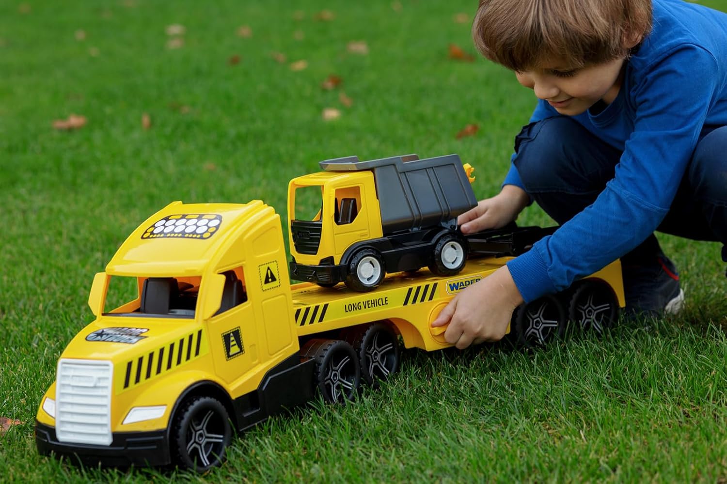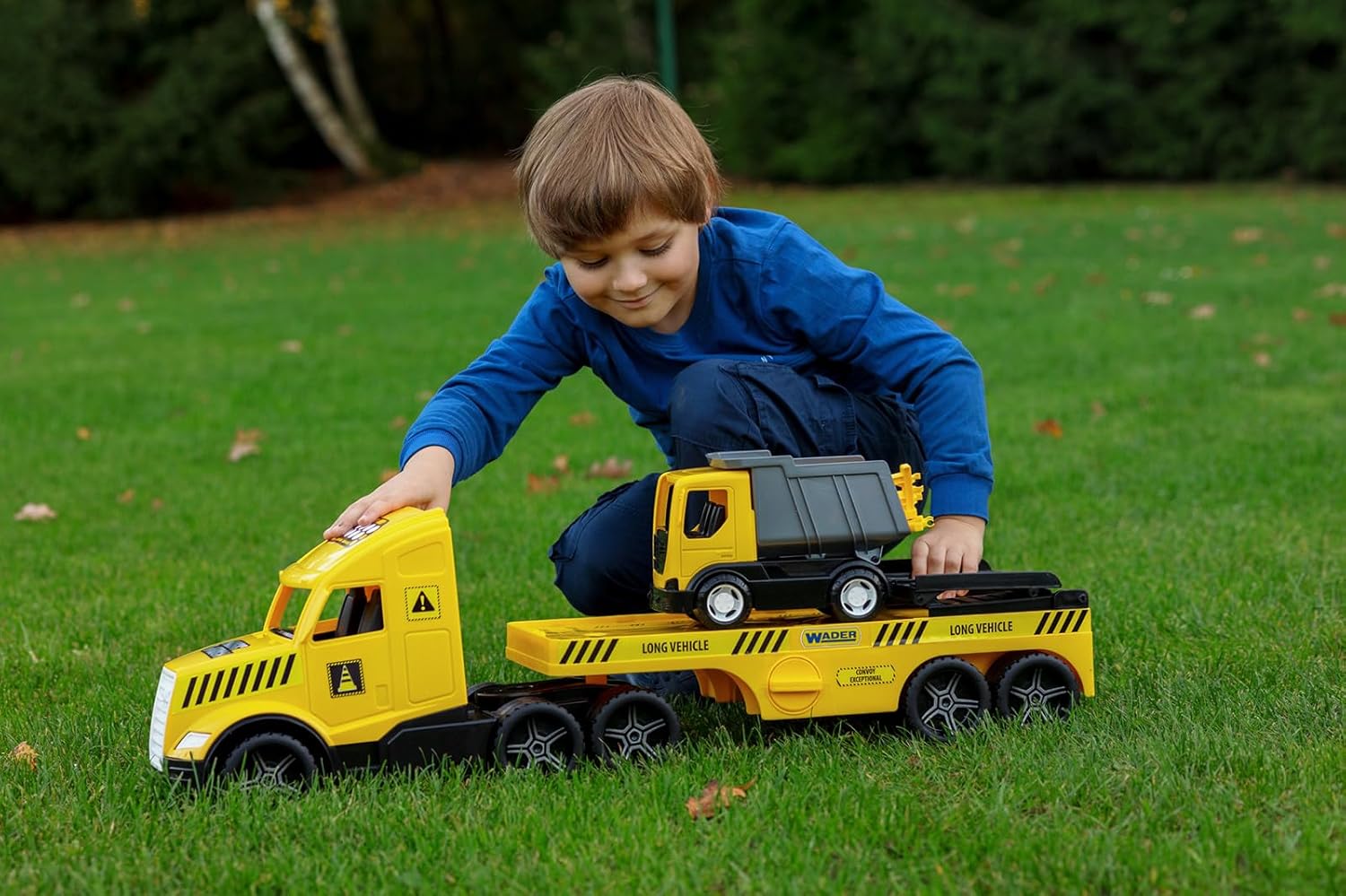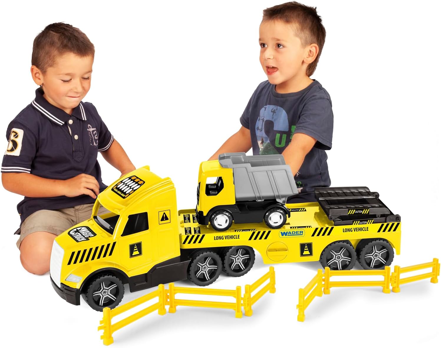 With the Magic Truck vehicles, even the smallest ones can emulate their big idols. The low loader is approx. 79 x 28 x 19.5 cm and comes with a small tipper, barrier grids and loading ramps. The fluorescent headlights glow in the dark. In combination with other toys and vehicles from Wader boys and girls can recreate many imaginative situations. This promotes motor skills, coordination and social behaviour and stimulates the child's imagination. The toy is made of robust plastic, is free from any harmful substances, high-quality workmanship and therefore particularly durable.