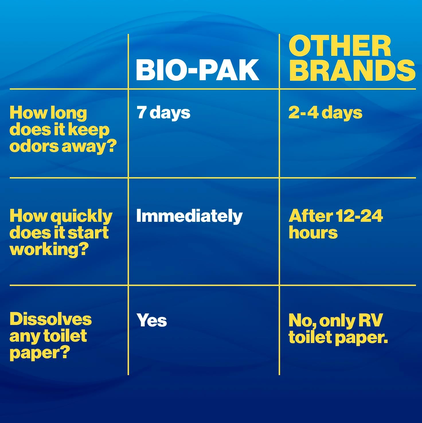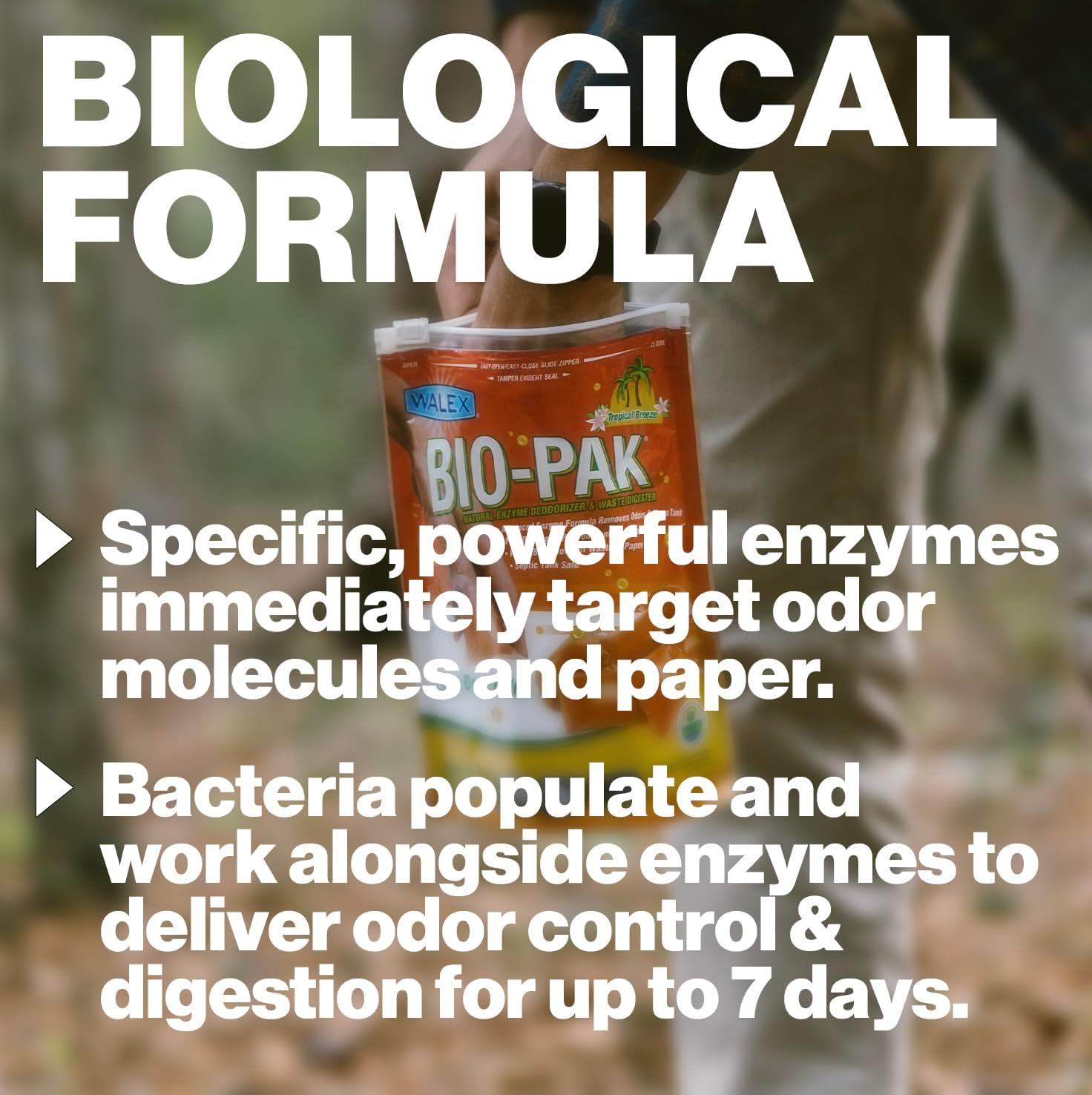 Tired of battling unpleasant odors and struggling with clogged black tanks? Look no further than Bio-Pak enzyme RV and marine holding tank deodorizer, your ultimate solution for a pristine RV or marine experience. Bio-Pak RV and marine toilet deodorizer is the ultimate marine toilet cleaner, camper tank deodorizer, portable toilet deodorizer, and black tank deodorizer for RVs and boats. Our formula contains powerful enzymes that not only control odors but also efficiently break down paper and waste. Our innovative, water-soluble tabs are designed for your convenience. Simply drop one in, and Bio-Pak RV and boat toilet cleaner starts working immediately without any messy spills. Continued use helps pipes, valves, and seals stay working smoothly. Bio-Pak marine and RV black tank pods are environmentally responsible. Our septic system-safe formula breaks down naturally and is campground friendly, ensuring you leave a minimal footprint on the outdoors. Don't let unpleasant odors and clogs spoil your journey. Upgrade your RV or boat with Walex Bio-Pak RV black holding tank deodorizer drop-ins and waste digester.