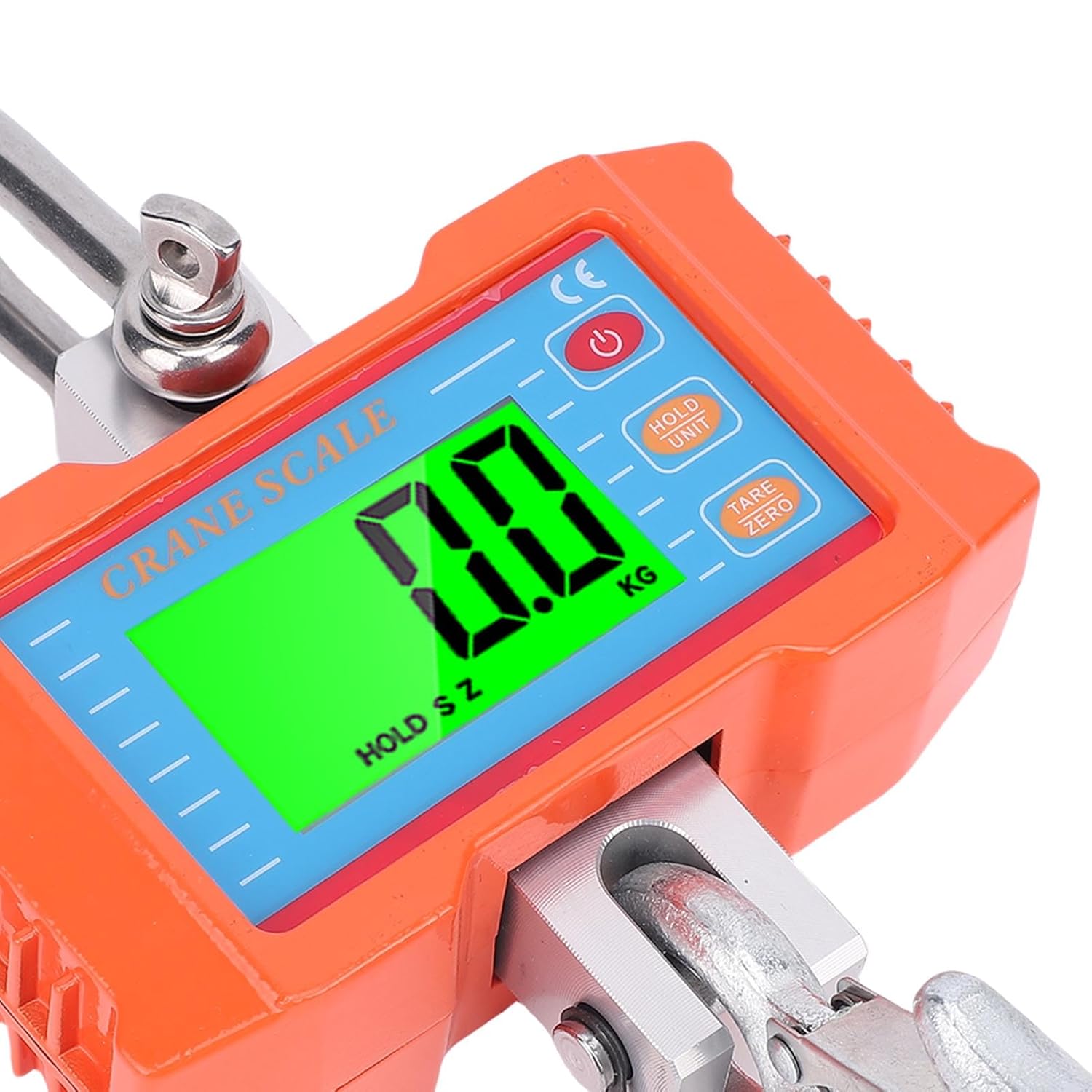 Specification: Item Type: Digital Crane Scale Model: OCS-P1-G Color: Orange Material: Aluminum alloy, alloy steel, stainless steel Weighing Capacity: 2000kg / 4400lbs Unit Conversion: KG, Lb, UN Accuracy: OIML 3 level Zero Range: 4% of maximum load Reading Stability Time: 3-7 Seconds Overload Reminder Value: 100 Percent maximum weight plus 9D' s Maximum Safe Load: 125% of maximum weight Resolution: 0.5lbs Limit Coefficient: 4 Display: LED 1/14in, 5 digits Hanging Scale Power Supply Type: Requires 2 x AA batteries (not included) Wireless Remote Control Power Supply Type: Requires 2 x AAA batteries (not included) Wireless Remote Control Controllable Distance: ≤ Approx. 19.81m / 65ft How to Use: Use according to the user manual Package List: 1 x Electronic Crane Scale(batteries not included) 1 x Remote Control(batteries not included) 1 x User Manual 1. ACCURATE MEASUREMENT: The digital hanging scale with a maximum capacity of 2000 kg/4400lbs is equipped with accurate sensors, featuring high measurement accuracy. The accuracy of the hanging scale is OIML level 3, with unit switch, data retention, tare weight, reset function 2. STURDY AND STRONG: The thickened aluminum cast cover, stainless steel hook loop and alloy steel hook make this hanging scale sturdy and long lasting. The sturdy steel hook has a strong load bearing capacity 3. CLEAR DISPLAY: The electronic crane scale features a 1/14in high brightness LED display, 5 digits with backlight, and quality integrated circuits, has excellent long term stability and can be clearly seen and read from a distance. Suitable for both indoor and outdoor weighing occasion 4. SUPPORT REMOTE CONTROL: The electronic hanging scale is equipped with a remote control, allowing for remote operating. The controllable distance of the remote control is ≤65ft. Just press a key to get the pounds. When you turn off and