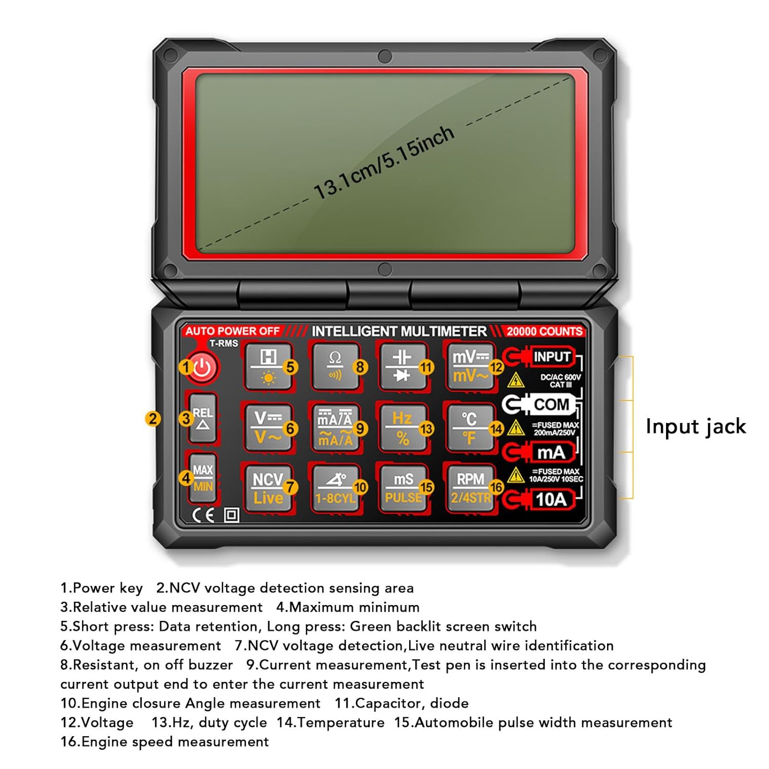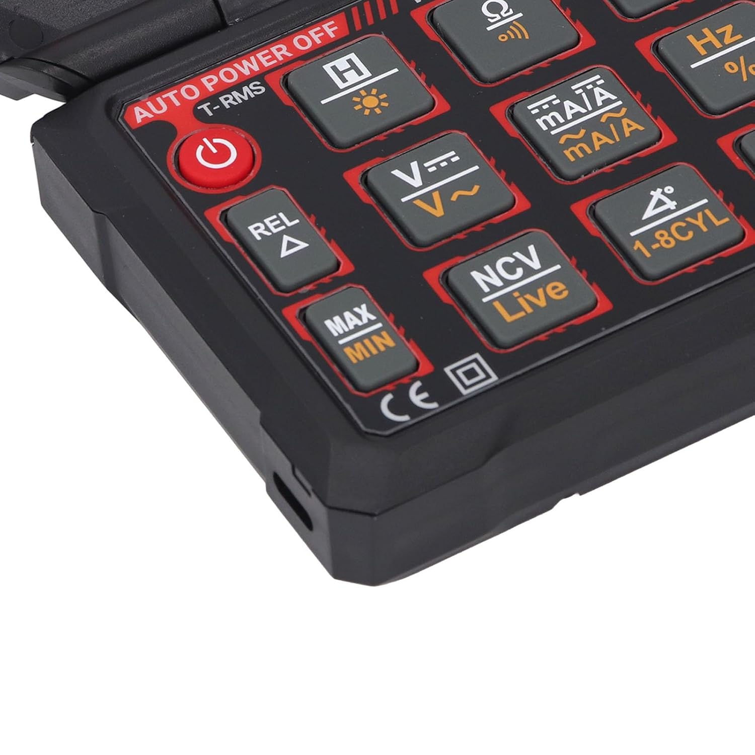 1. RPM Engine Speed Measurement: Measure the number of rotations per minute of the engine spindle, selecting the appropriate engine stroke for accurate RPM measurement with the RPM key. 2. Dwell Angle Measurement: Measuring the dwell angle of the ignition system is crucial. Dwell measurement refers to the duration the breaker switch remains closed while the camshaft rotates. Select the cylinder count for accurate measurement. 3. Automotive Pulse Width Measurement (mS PULSE): Measure fuel injection system pulse width, switch to PULSE mode, connect the black test pen to the fuel injector ground or a car ground, start the engine to measure pulse width time. 4. NCV Detection: Switch to NCV function, display EF, when the NCV sensing area at the bottom left of the meter detects AC voltage, the meter emits an audible reminder and the LCD analog bar displays the sensing strength. 5. Flip Top Large Screen Flexibility: Adjust the angle up to 180° for convenient measurement, easy to carry and place, suitable for on the way automotive diagnostics. 6. Live Neutral Wire Detection: Distinguish between neutral and , instantly detect fire wire installation with an alarm and no for neutral lines. 7. USB Charging Plug and Play: Say goodbye to the age of batteries with USB data cable charging for the built in 3.7V 1800mAh li battery, offering easy charging through USB li direct charging for quick and convenient use. Specification: Item Type: Digital Multimeter Material: ABS Battery: 1 x 3.7V Li Battery (Built in) Capacity: 1800mAh (Single Battery Capacity) How to Use: Turn on the device to use it. Package List: 1 x Flip Multimeter 2 x Test Pen 1 x Temperature Probe 1 x Charging Cable 1 x Instruction Manual 1 x Storage Bag Notice: Detection operation may be affected by factors such as socket design, insulation thickness, etc.