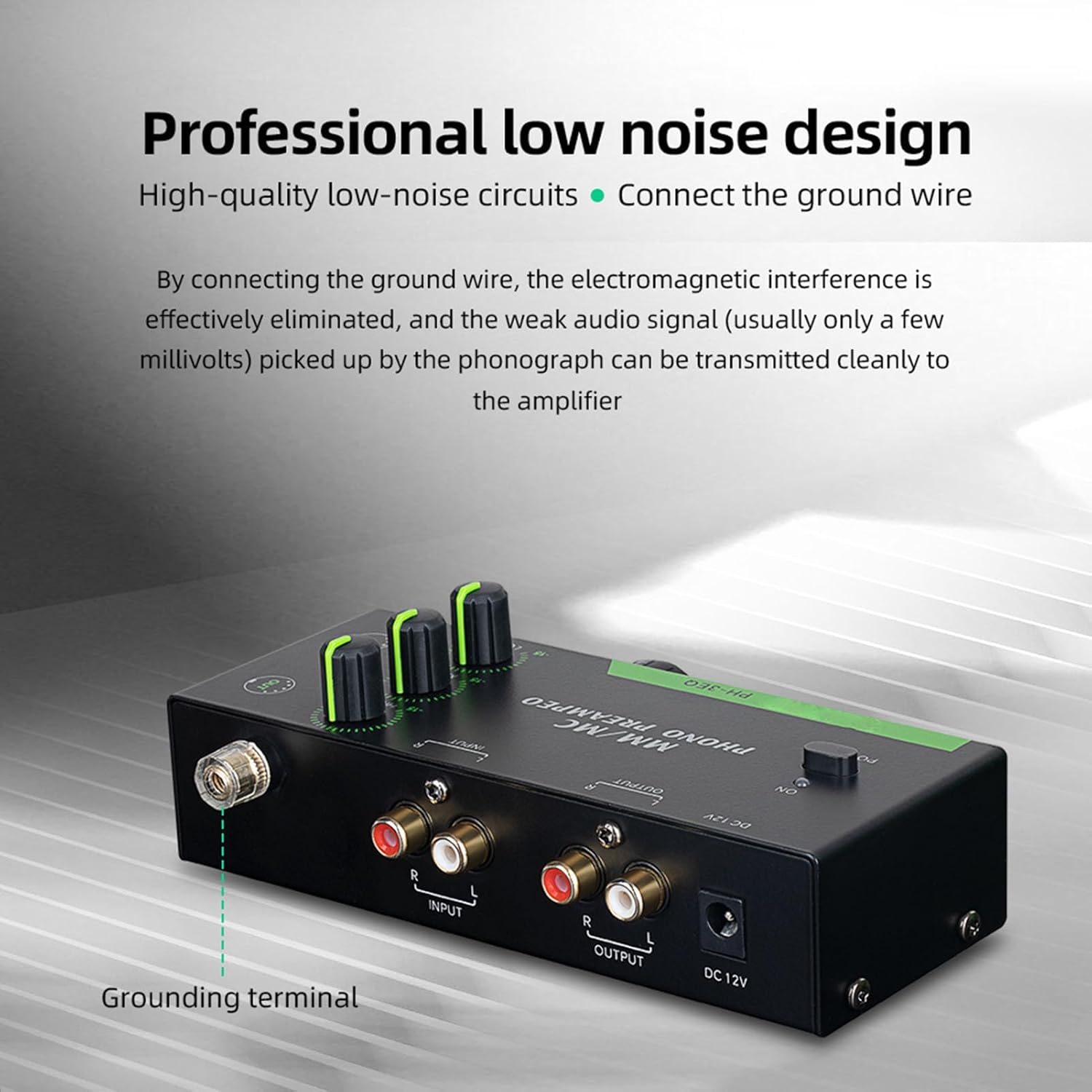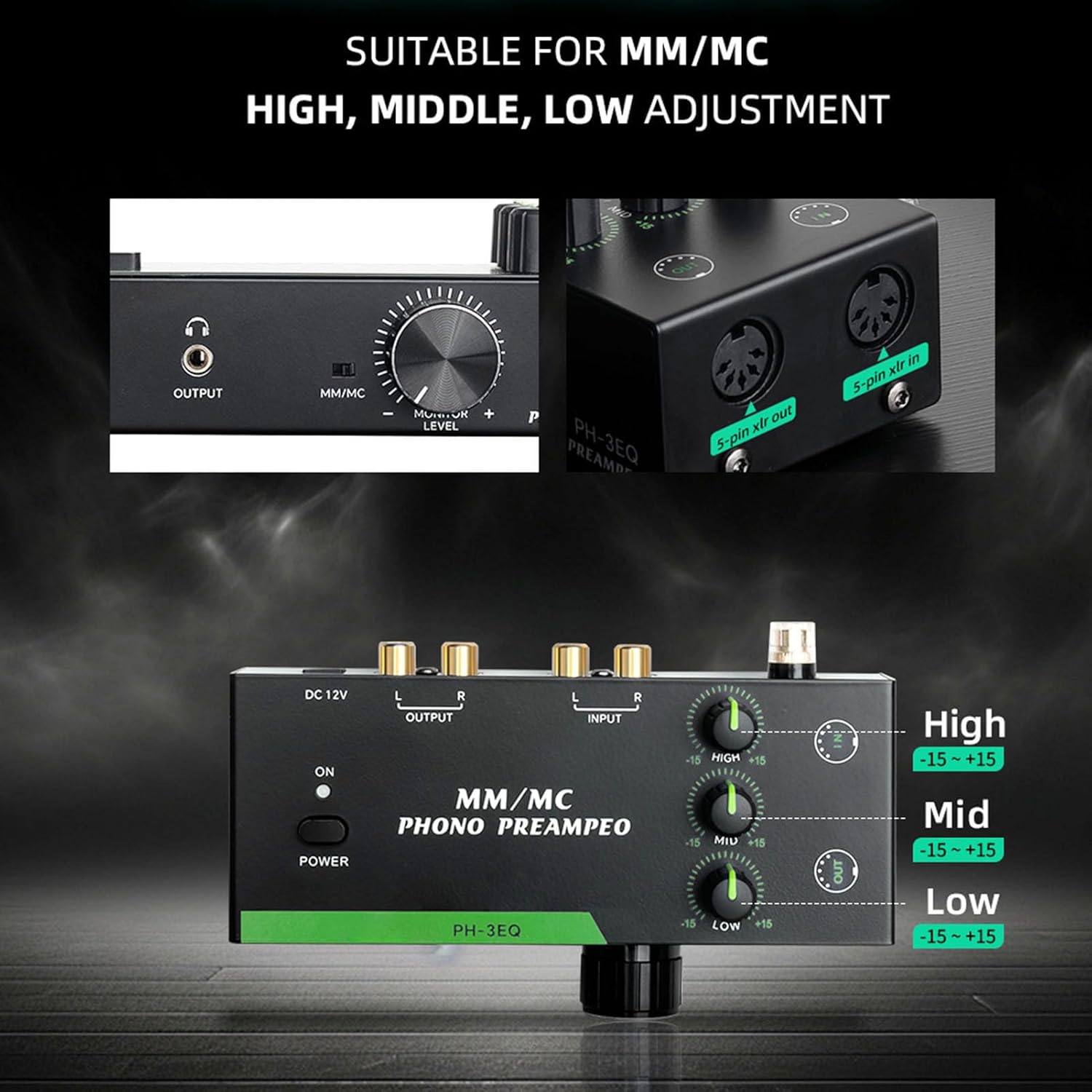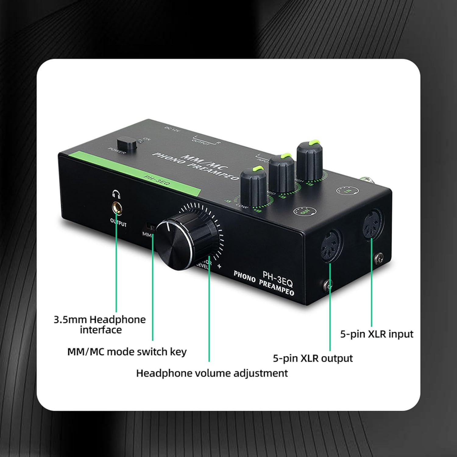 [Precise Frequency Control] The professional mini preamp offers independent adjustment of high, medium, and low frequencies with a wide control range from -15 to +15. customize your sound profile to perfection whether you're enjoying the deep bass of classical music, vibrant mids of jazz, or crisp highs of acoustic guitar. [Noise-reduction Technology] Our adjustable phono preamp effectively balances connections between microphones and line-level devices like mixing consoles and sound interfaces. advanced circuitry minimizes electromagnetic interference to deliver clean, stable sound transmission without unwanted noise. [Versatile Connectivity] This phono preamplifier features mm/mc mode switching for both line output to active speakers and a 3.5mm headphone output. enjoy maximum flexibility whether you're using professional sound systems or personal headphones for private listening sessions. [High-fidelity Sound Reproduction] The mm/mc phono preamp captures weak sound signals from your turntable with precision and applies balanced compensation based on record standards to restore the original rich tone of your . experience crystal-clear audio with enhanced depth and detail for a truly immersive listening experience. [Professional-grade Performance] Built for audiophiles and music professionals, this stereo phonograph preamplifier ensures reliable signal transmission between audio devices. the durable aluminum alloy construction houses premium components for turntables and record players that demand studio-quality sound reproduction. Spec: Item Type: MM/MC Phono Preamp Transmission: 10Hz-20kHz (+/- 0.5dB); 10kHz-50kHz (+/- 2dB) Distortion Coefficient: Input Sensitivity: MM: 58 MV, MC: 6.8mV Signal To Noise Ratio: MM>83 dB, MC>70 dB Input Impedance: MM: 47 KOhm, MC: 100 Ohm Output Impedance: 250 Ohm, Gain Ratio: MM: 40 DB, MC: 60 dB Input Capacitance: 300pf Input: 1 x Stereo, 1 x 5 pin DIN (DCIN