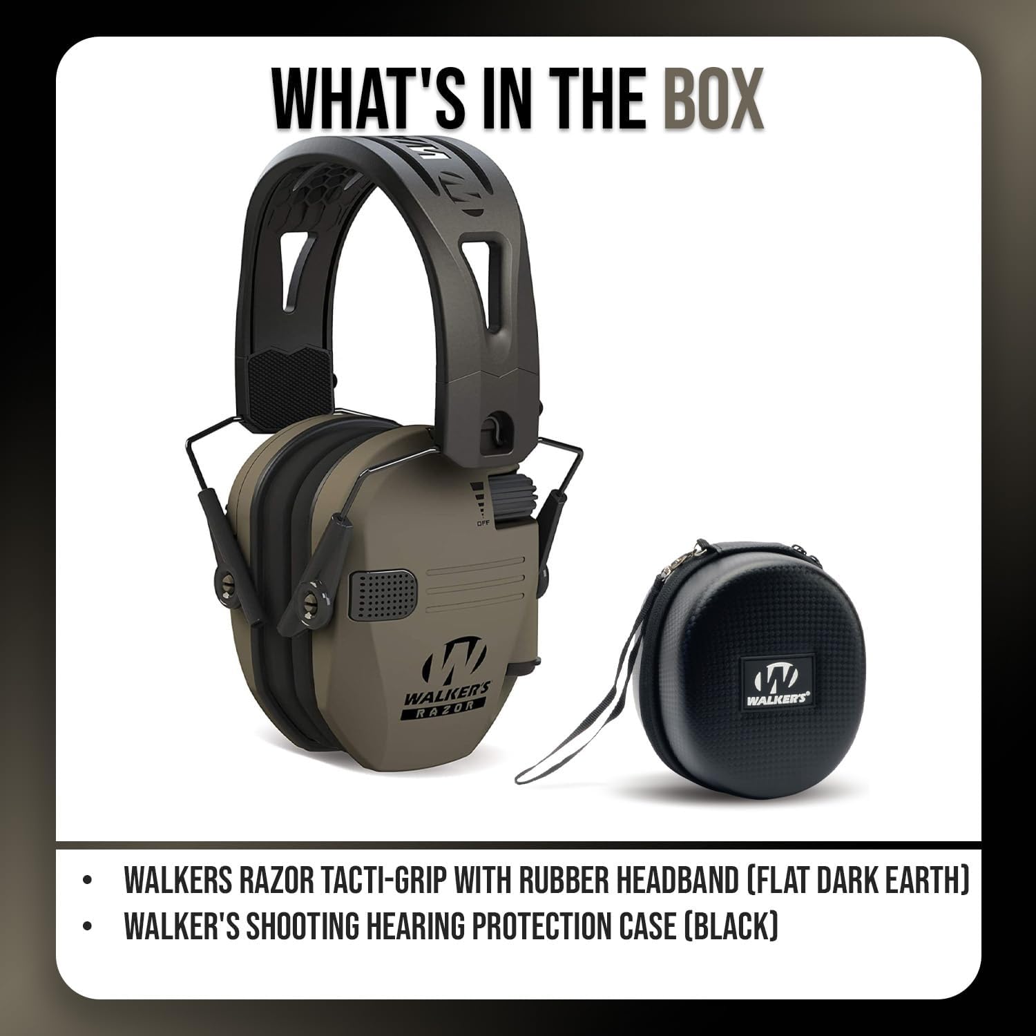 Walker's Razor Tacti-Grip with Rubber Headband (Flat Dark Earth)Walker’s Razor Tacti-grip high-performance silicone composite headband ensures a slip-free, secure fit. The full dynamic range HD speakers offer clear, balanced sound. This electronic earmuff features active dynamic sound suppression, hi-gain omnidirectional mics, wind noise reduction, an audio input jack, and a comfortable headband with a metal wireframe. The compact folding design makes transportation easier, and the gel earpads provide comfort for several hours of use.Walker's Shooting Hearing Protection Case (Black)The Walker's Shooting Hearing Protection Case is designed to protect your Walker's muffs.CompatibilityThe Walker's Shooting Hearing Protection Case will fit most Walker's muffs, including Razor and XCEL series.DurabilityThe case is shockproof and weather resistant and made with durable, long-lasting EVA material. It features a double zipper closure and a removable wrist strap for convenience.Bundle Includes:Walker's Razor Tacti-Grip with Rubber Headband (Flat Dark Earth)Walker's Shooting Hearing Protection Case (Black)