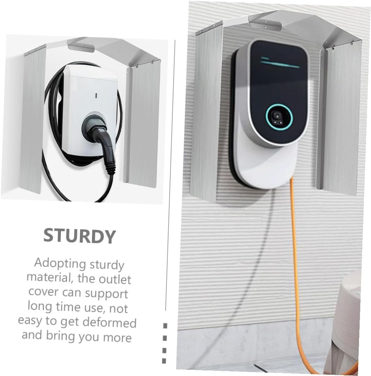 Package List 3 x Outlet Cover Parts 9 x Screws 4 x Nuts Features -Color:Silver -Size:45.00X40.00X20.00cm/17.68X15.72X7.86in -Material:Stainless steel -Product Info:Charging pile protective cover - Made of sturdy materials and good workmanship, the outlet cover will not easy to deform or break, can be used for long time. - Practical plug protector is also suitable for kitchen, balcony, garden, garage, office, restaurant, etc wall outlet cover. - The outlet cover of wall mount design, is easy to install, no need of other complicated tools outlet safety cover. - Simple color, delicate appearance, the outlet cover can be fit for most outdoor environment. - This outlet cover can have good protection effect, offer a much safer charging environment socket outlet dust protector.Goods Descriptionoutlet plug protective cover Reasonable structure, light weight, the wall outlet cover is easy to install, bring you satisfying using feeling, offering a safer environment.waterproof socket cover The outlet cover is convenient and practical, with excellent texture, can serve you for a long term without being easily damaged