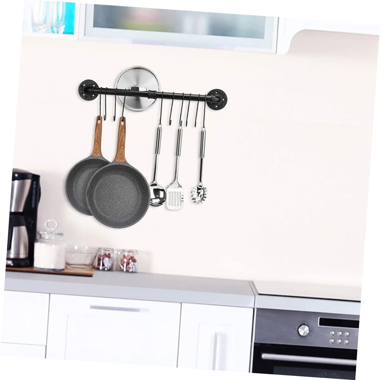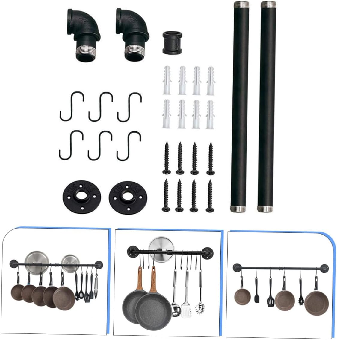 Package List 2 x rods 2 1 x connector 2 x bases 8 x screws 8 x expansion tubes 6 x hooks Features - Color: Black. - Material: Iron. - Size: 60.00X13.00X5.00cm/23.58X5.11X1.97 inch. -Product Info:Pot lid stand - Save space with this kitchen counter organizer while creating a farmhouse wall decor! pot hanger wall mounted - Manufactured with premium iron material, and practical enough to use. - This storage rack installed with screws can hold heavier loads than self-adhesive hooks kitchen utensil hanger. - It can be used in bathroom to store towels and other items and in kitchen to store various kitchenware pot pan rack. - This kitchen storage rail is outstanding with its durability and well-construction that prevents the hooks from falling off hanging pan racks for kitchen.Goods Descriptionhanging pots and pans rack This is a storage rack, which is manufactured with premium iron material, and practical enough to use.kitchen utensil holder rack This storage rack installed with screws can hold heavier loads than self-adhesive hooks.utensil rack with hooks It can be used in bathroom to store towels and other items and in kitchen to store various kitchenware