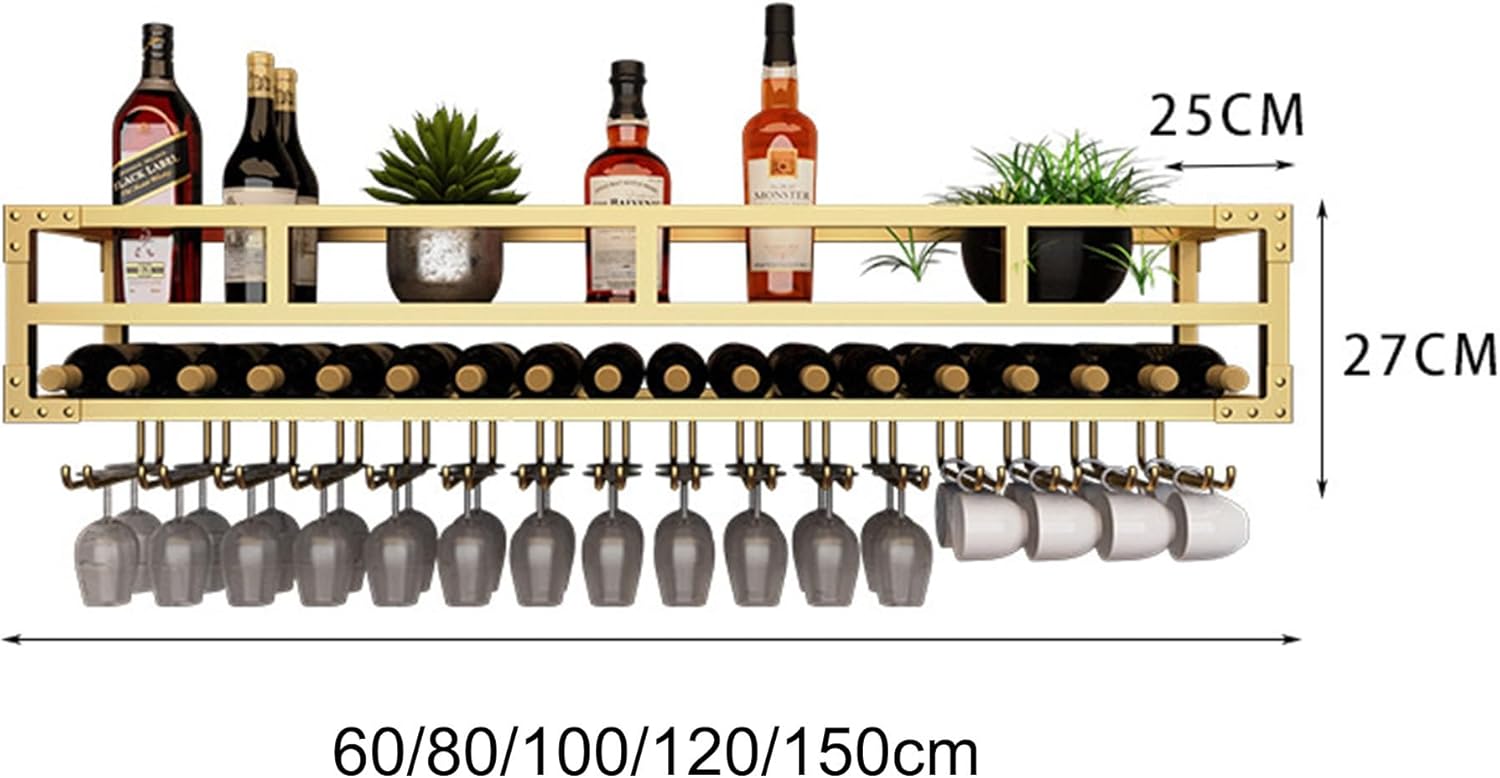 Beautiful wine rack for every styleModern style wine bottle rack is also a perfect home decoration for you. You can hang it in your kitchen, dining room or your home wine bar. Give your house a classy touch.Name: Wall Mounted Wine Rack with Wine Glass Rack Bar Shelves with Wine Glass Holders Hanging Under Shelf Wine Bottle Storage Holder Material: IronMetal structure process: weldingFurniture structure: frame structureColor: black/goldSize:60*25*14cm , 80*25*14cm , 100*25*14cm , 120*25*14cm➽Tips1. About color---------There may be color difference due to display screen or shooting light, please understand!2. About size---------Due to different measurement methods, there may be an error of 1~2cm, please understand!3 About service---------Please identify the store“MMCJIES”,We can ensure product quality and after sell.If you have any questions, please feel free to contact us, we will reply you within 24 hours.