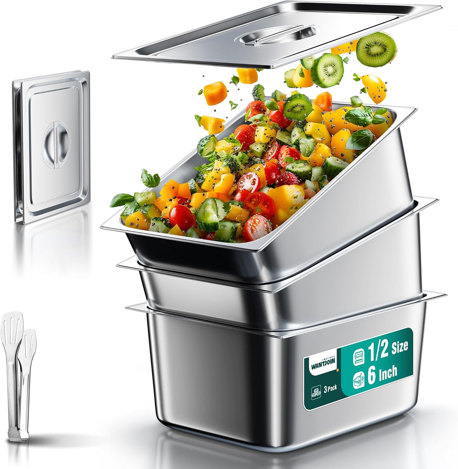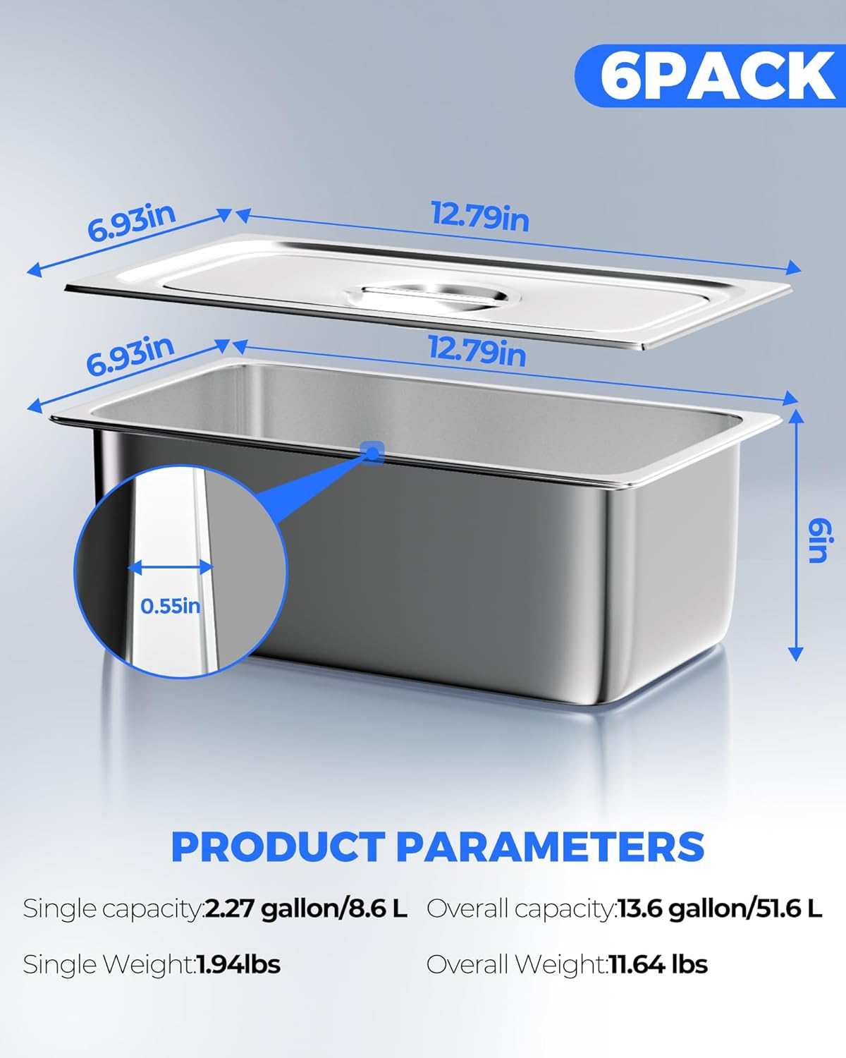 WantJoin Steam Table Hotel Pans with Lid 1/3 Third Size 6 Inch Deep 6 Pack, Stainless Steel Tray Sets Metal Food Storage Container, Restaurant Chafing Dishes Commercial Buffet Warmer Catering Supplies